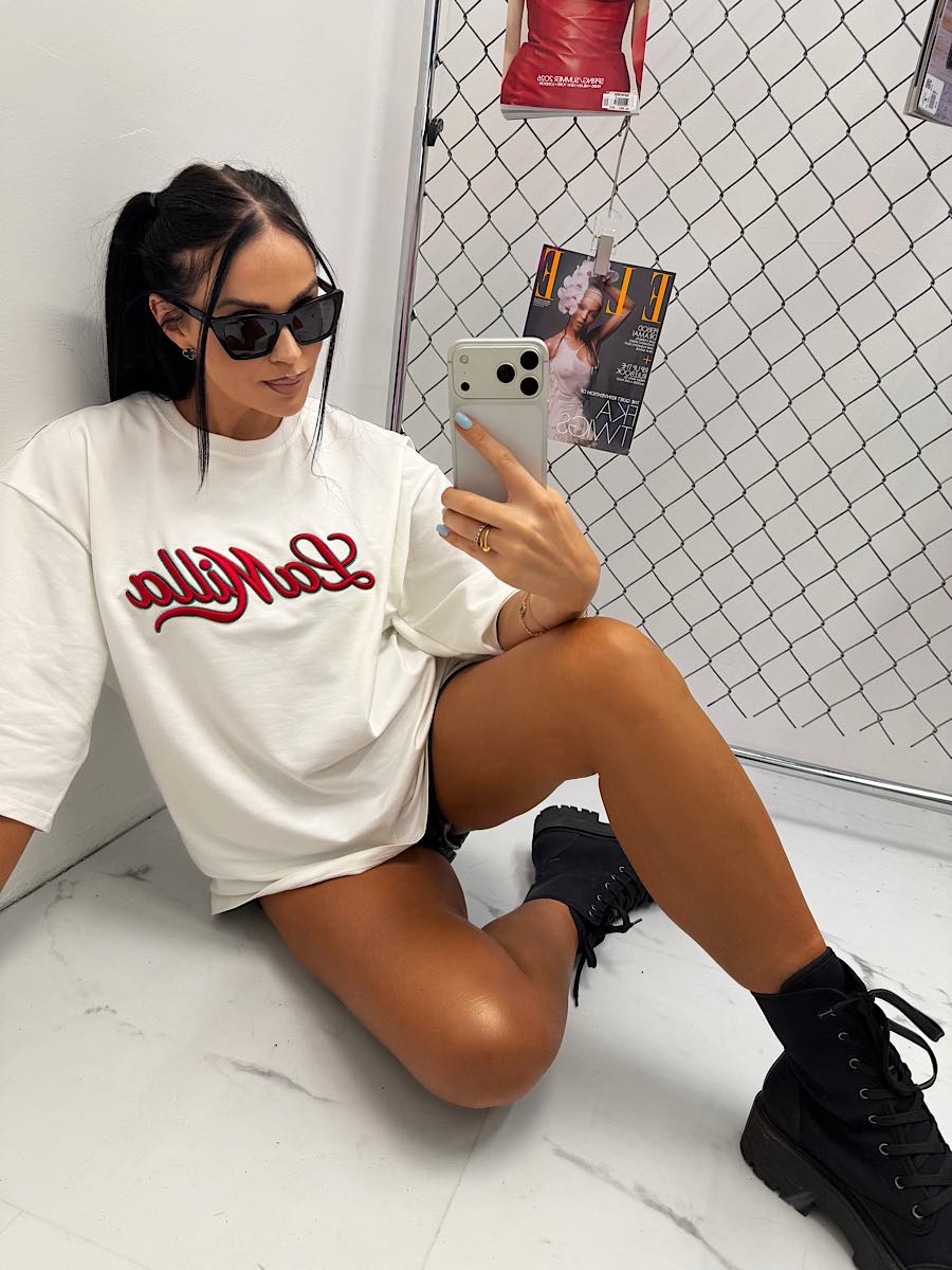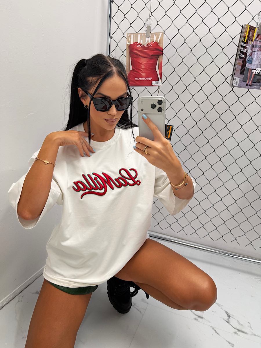 Wyszywany czerwony napis LaMilla pięknie odbija się od białego tła podkoszulki.