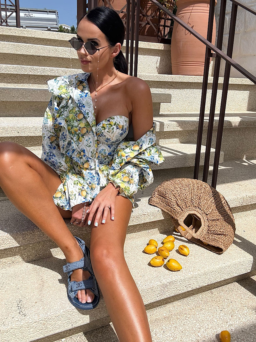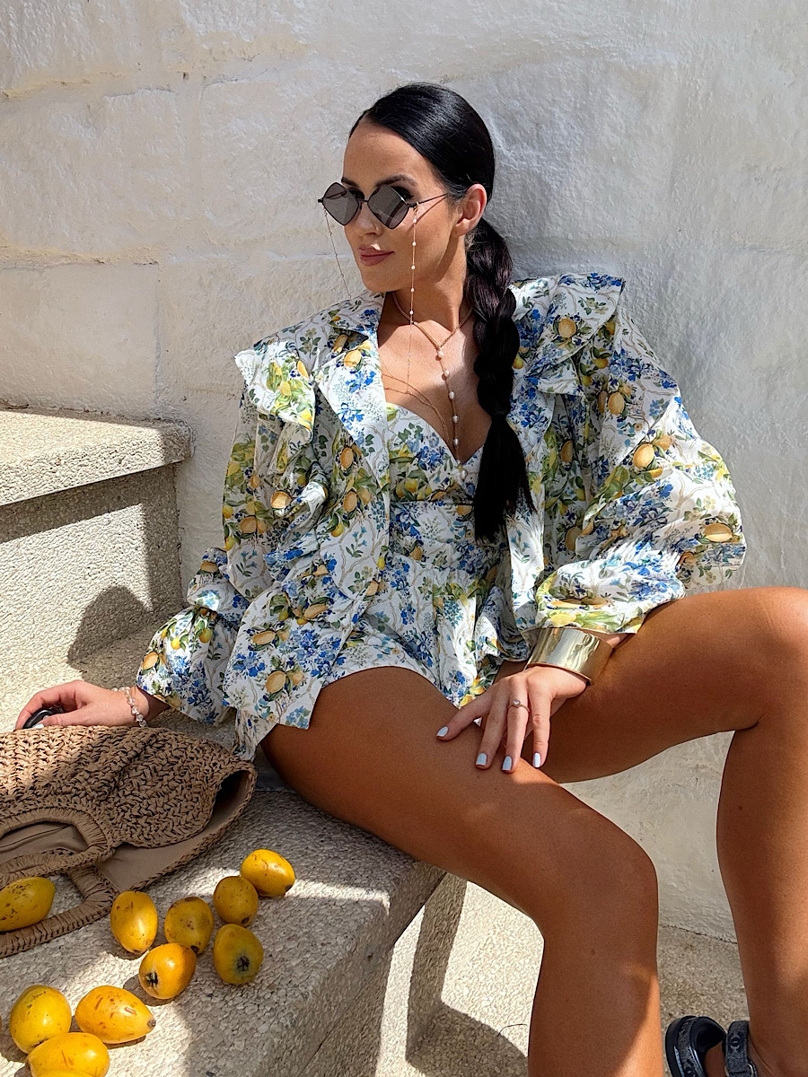Stylowe body LaMilla w romantycznym wzorze żółtych cytrynek w połączeniu z drobnymi, niebieskimi kwiatami w bardzo wakacyjnym klimacie.