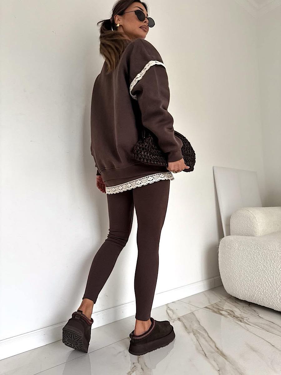 Przedłużana bluza w kolorze w brązowym, zdobiona przy rękawach ażurową falbanką.
