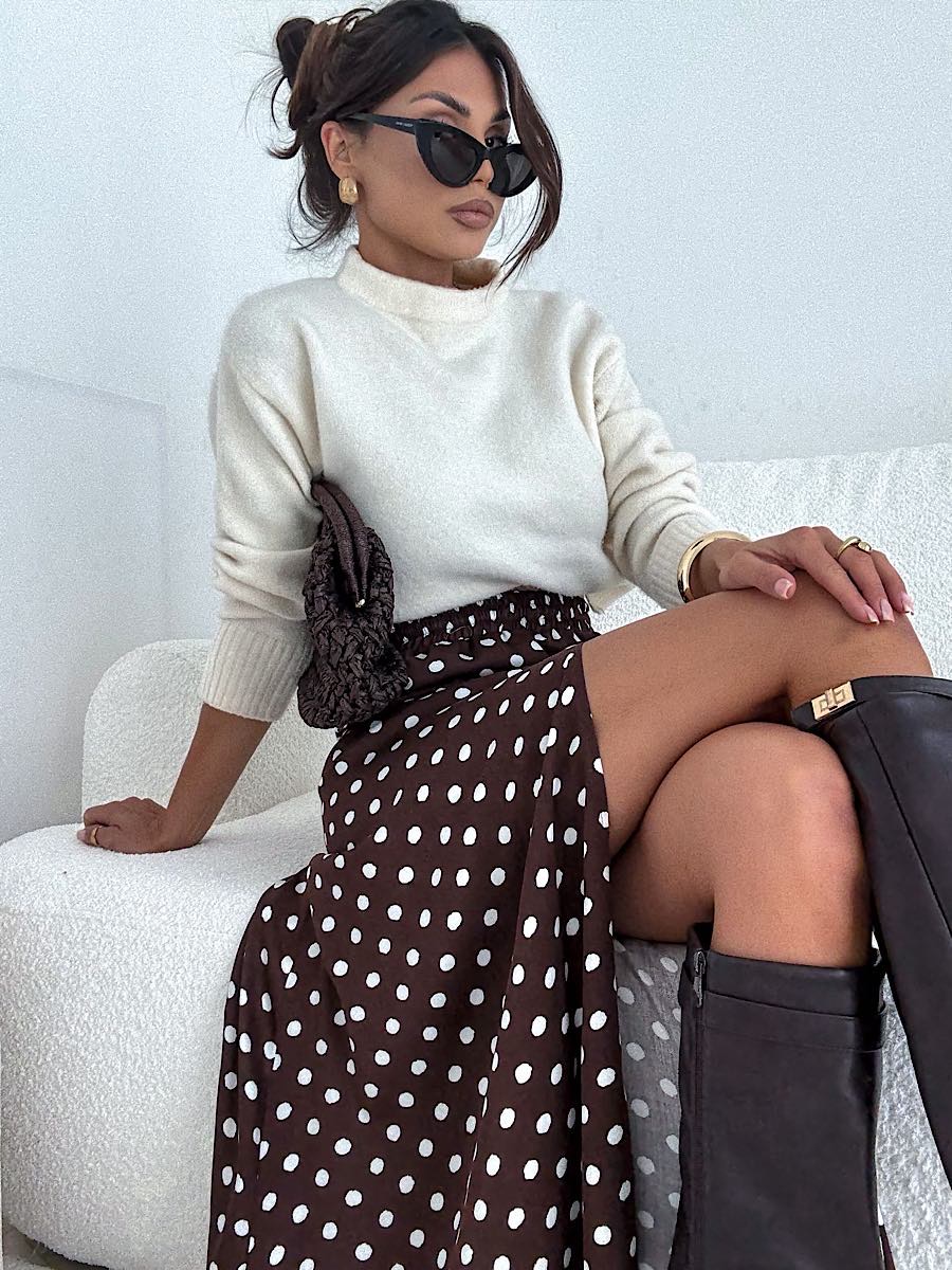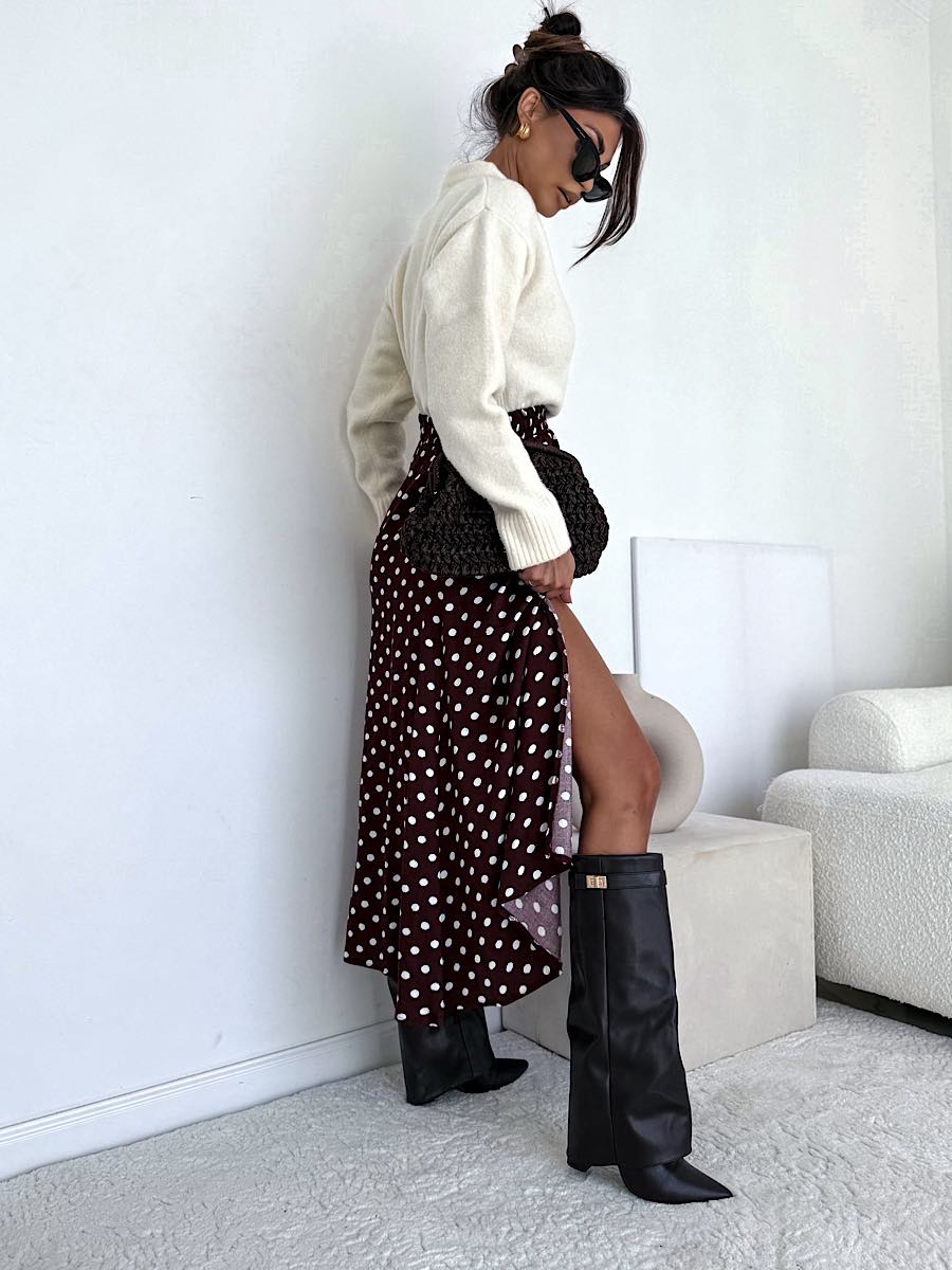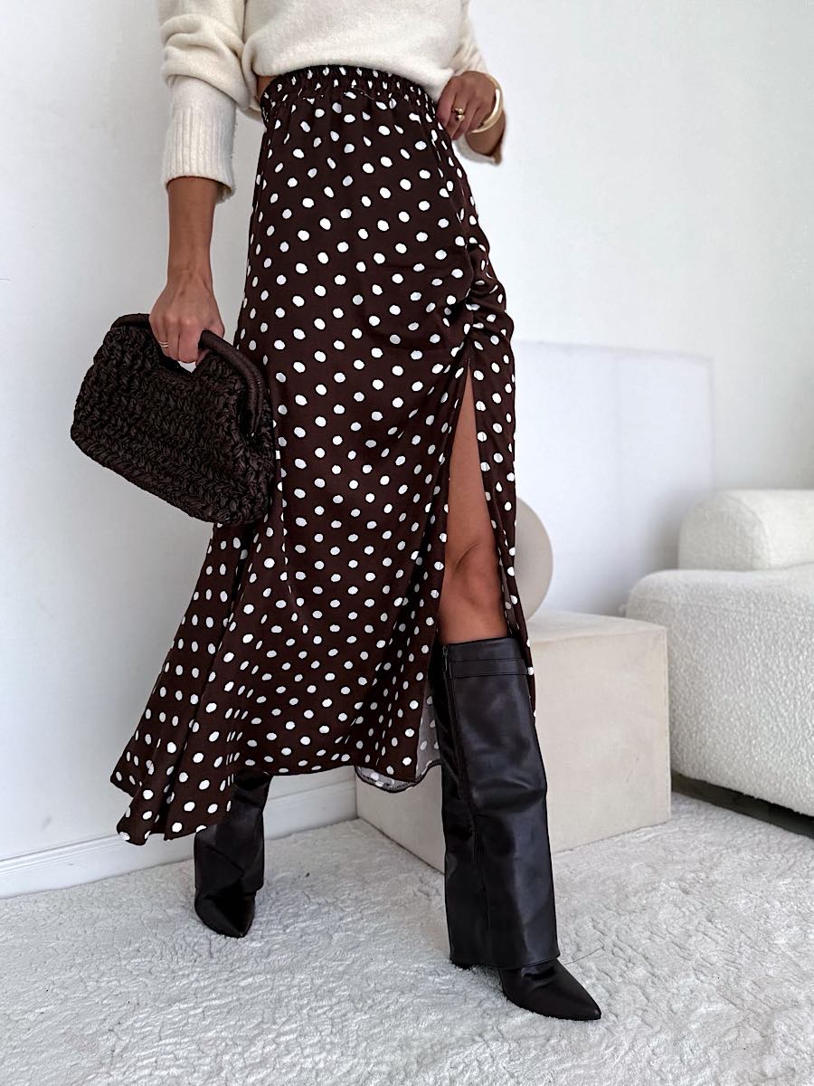 Tagi: brązowa spódnica, spódnica, spódnica w groszki, spódnica z rozcięciem