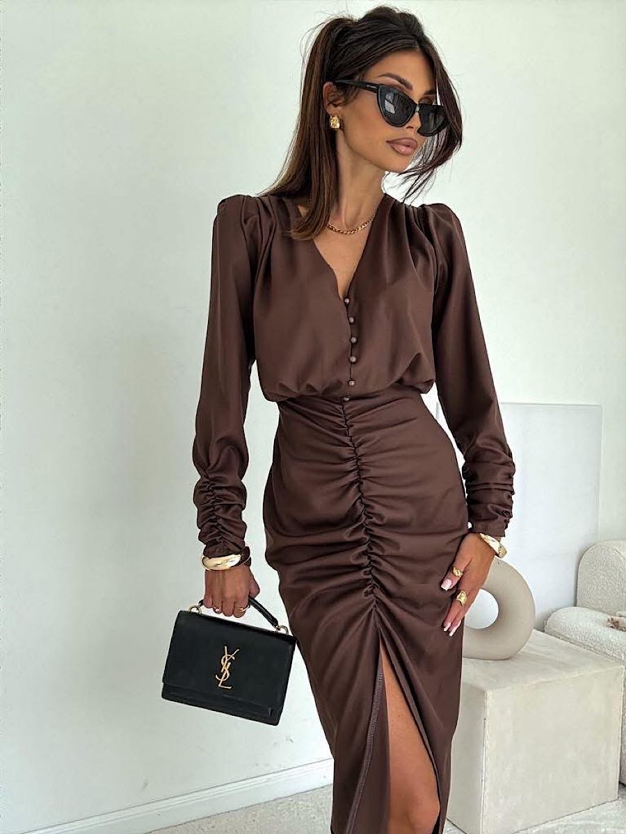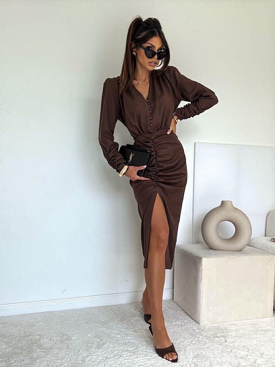 Sukienka wykonana z wysokiej jakości tkaniny w kolorze intensywnego brązu.