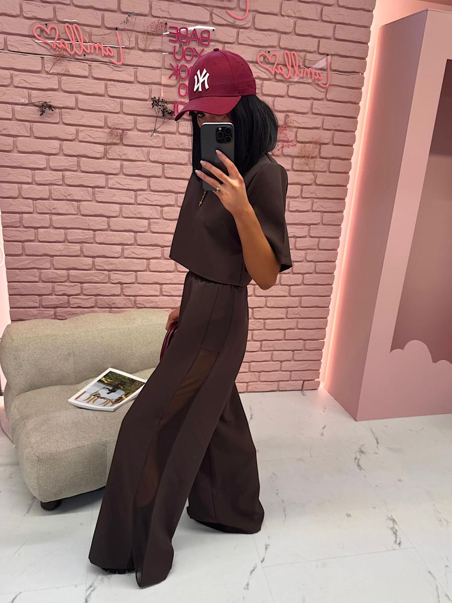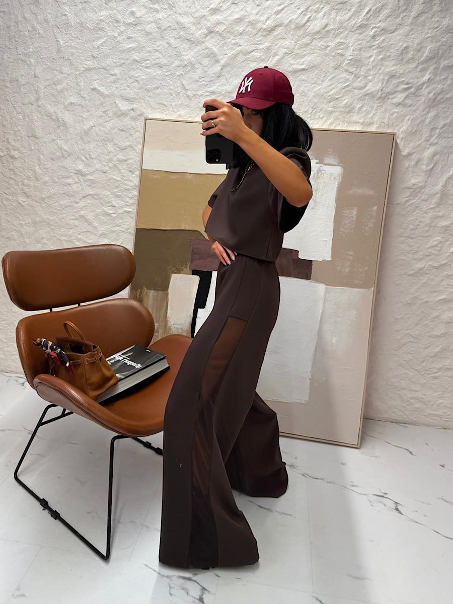 Tagi: brązowe spodnie, spodnie lamilla, spodnie na kantke, spodnie z boczną siatką, szwedy