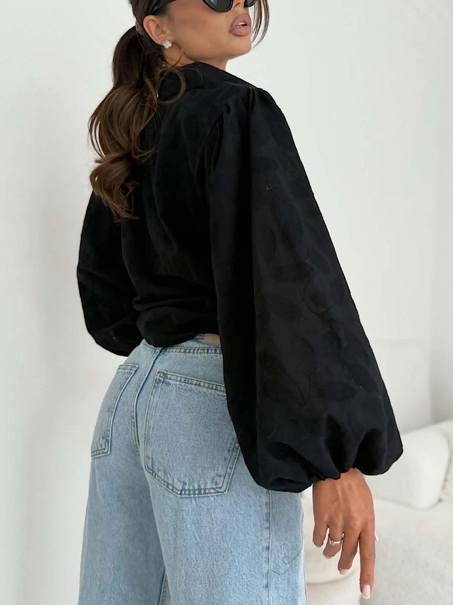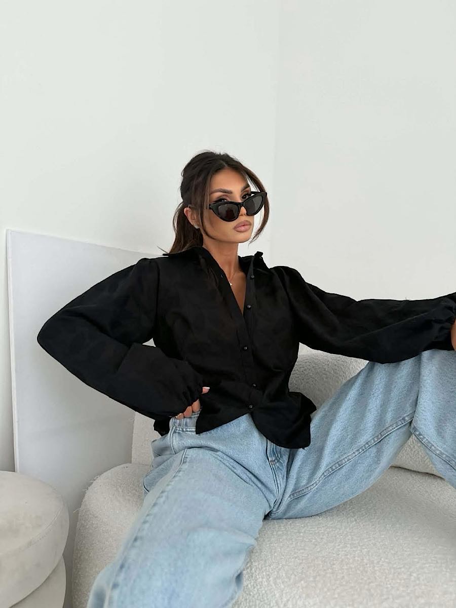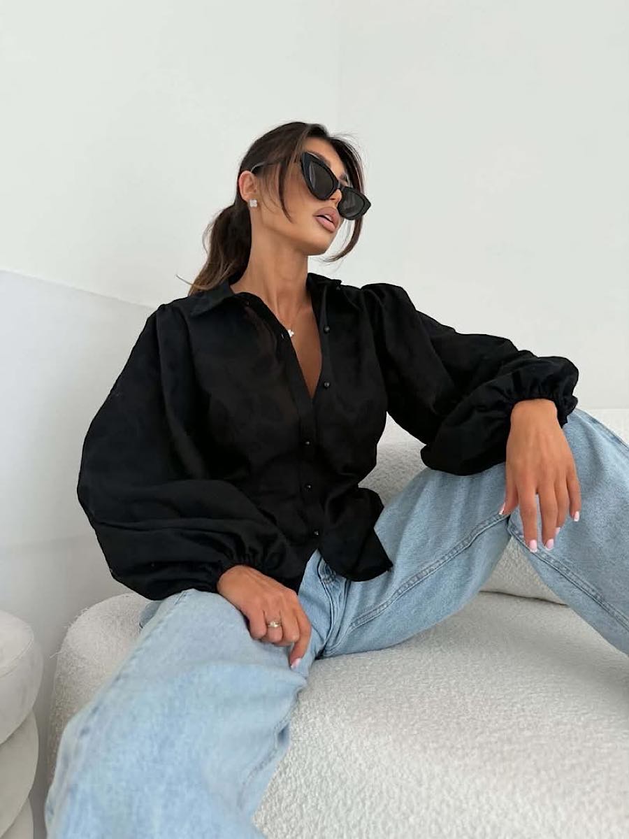 Luźny krój z szerokimi, bufiastymi rękawami zakończonymi gumką w nadgarstku.