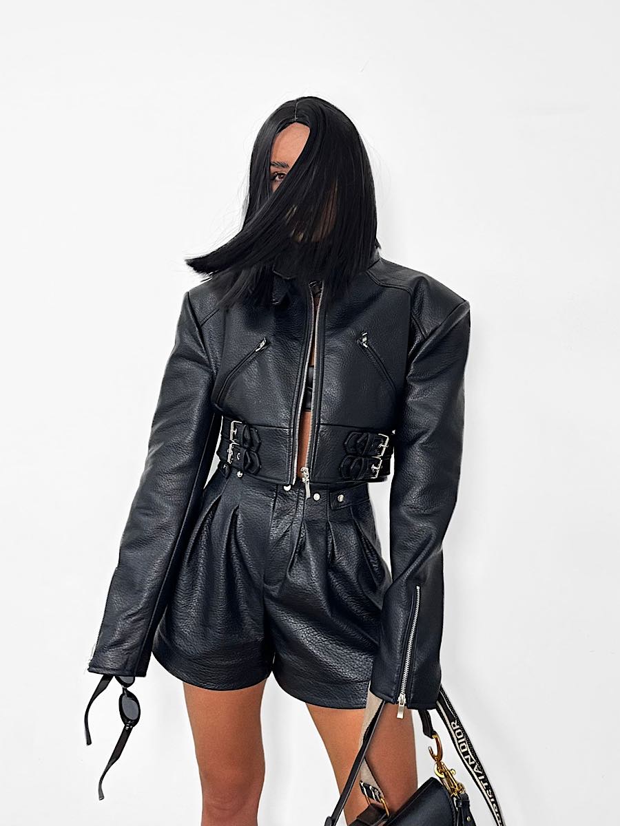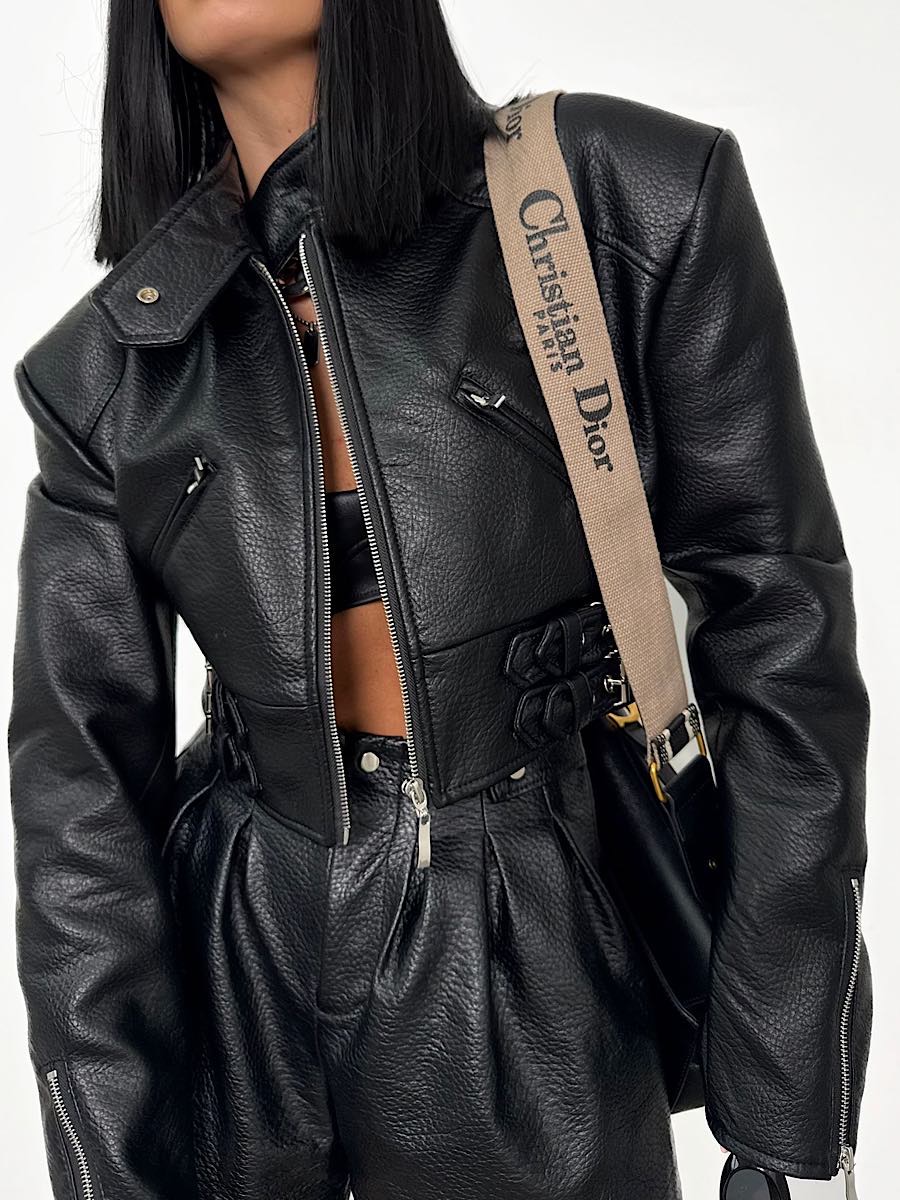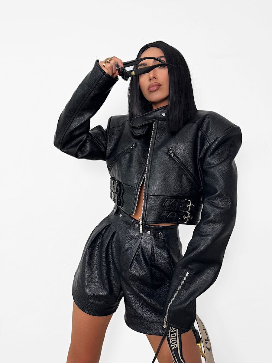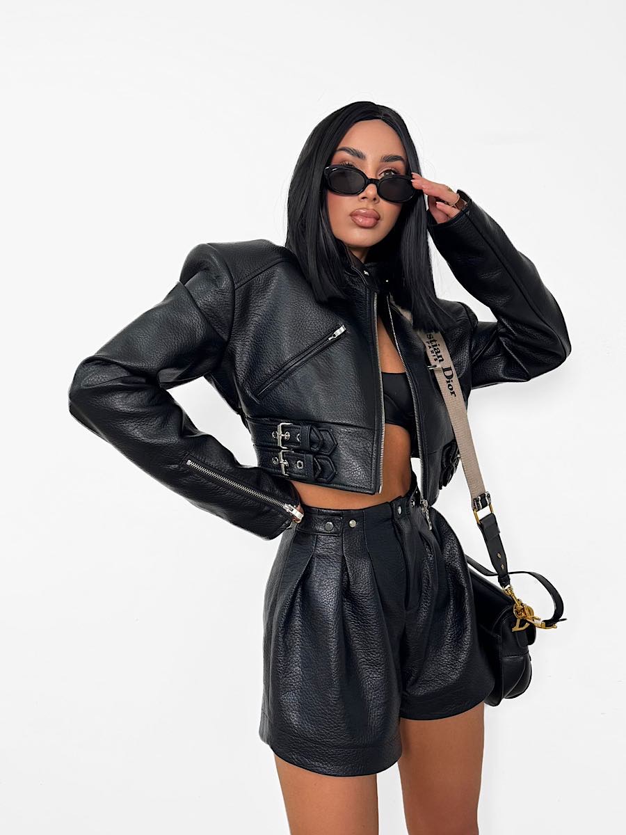 Czarna kurtka skórzana ramoneska LaMilla z ozdobnymi paskami