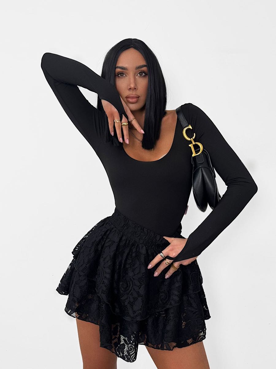 Czarne koronkowe spódnico – spodenki od polskiej marki premium LaMilla. Spódniczka uszyta jest z delikatnej koronki we wzorze kwiatowym. Asymetryczny fason z dłuższym przodem i tyłem w formie dwuwarstwowych falban. Wysoki stan z gumką w pasie pięknie podkreśla talię. To doskonały wybór na eleganckie, ale i codzienne stylizacje.