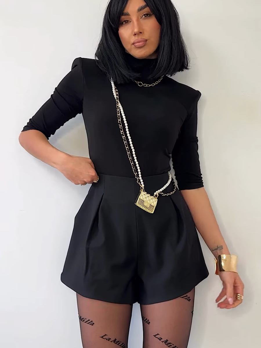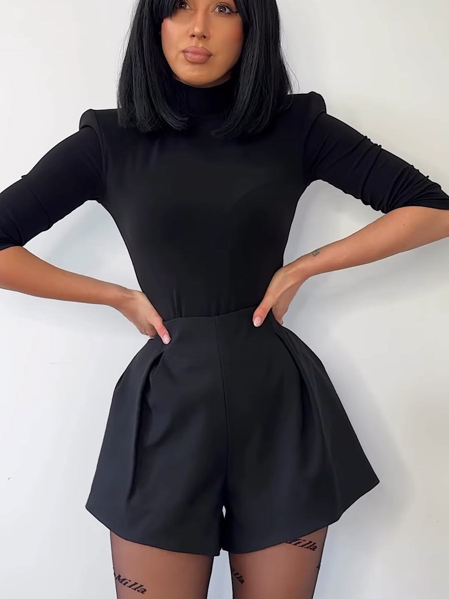 Stylowe i eleganckie czarne szorty o fasonie bombki to propozycja dla kobiet kochających nowoczesną klasykę i wygodę. Wykonane z wysokiej jakości wiskozy, gwarantują doskonałe dopasowanie do sylwetki oraz przyjemność noszenia przez cały dzień. Model LaMilla zachwyca idealnym krojem, który optycznie wydłuża nogi i podkreśla talię. Zapięcie z tyłu na dyskretny zamek sprawia, że szorty świetnie leżą i prezentują się wyjątkowo kobieco. Zaszewki z przodu nadają im bardzo oryginalnego charakteru. Stworzysz z nimi wiele pięknych stylizacji zarówno tych eleganckich, jak i codziennych outfitów.