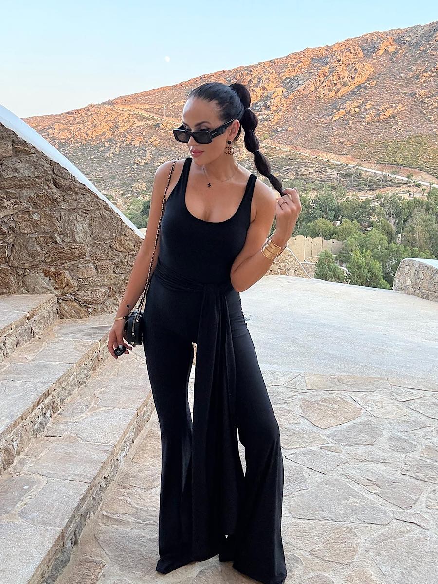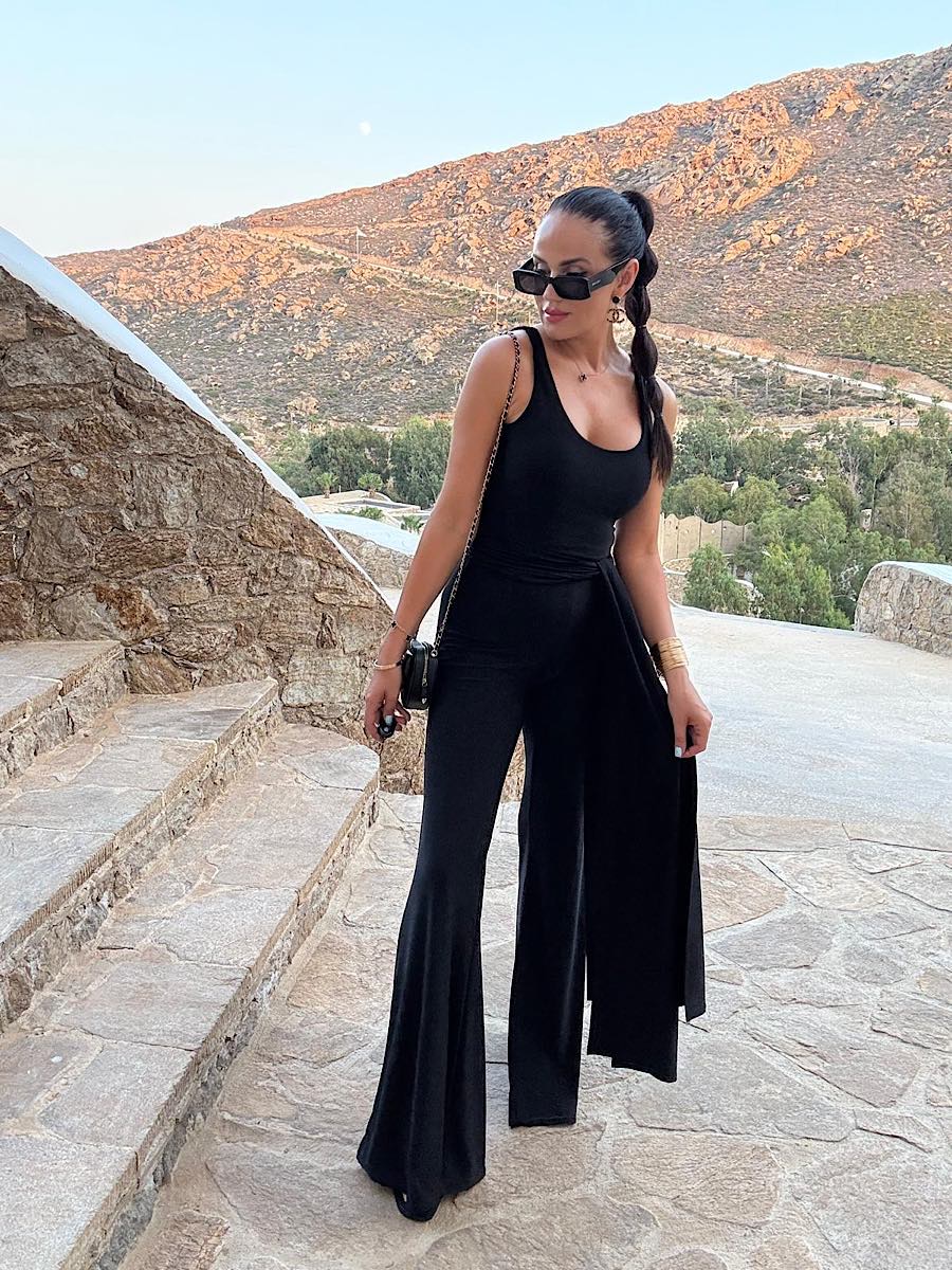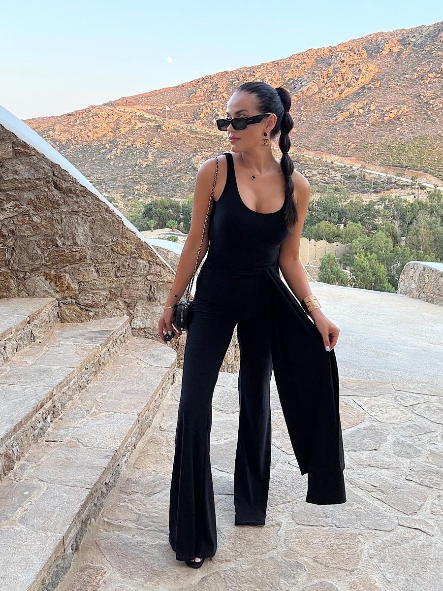 Elegancki i ponadczasowy czarny kombinezon LaMilla to propozycja, która łączy wygodę z wyrafinowanym stylem. Wykonany z miękkiej przyjemnej wiskozy, pięknie układa się na sylwetce i zapewnia komfort noszenia o każdej porze roku. Dopasowany fason z podkreśloną talią dzięki długiej szarfie którą przewiążesz w pasie i opuścisz luźno wiązanie dołem. Grube ramiączka pozwolą schować biustonosz a głęboki dekolt w łódkę pięknie podkreśli biust. Długa nogawka rozszerzająca się od kolana w kształcie dzwona optycznie wydłuża nogi i nadaje stylizacji wyjątkowego charakteru. Klasyczna czerń sprawia, że kombinezon jest niezwykle uniwersalny – sprawdzi się zarówno na wieczorne wyjście, jak i w codziennych stylizacjach z ramoneską czy marynarką.