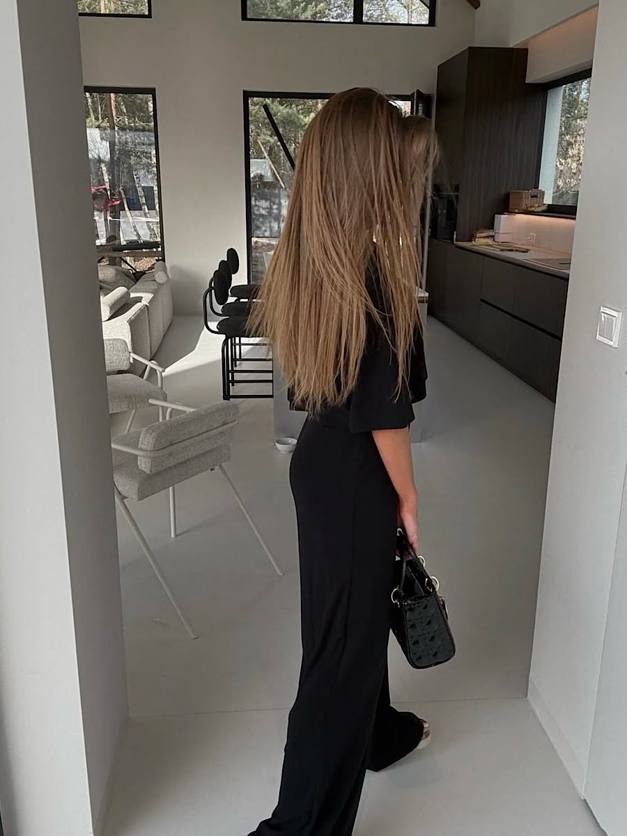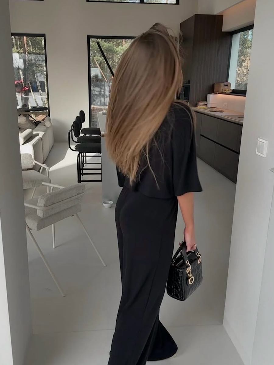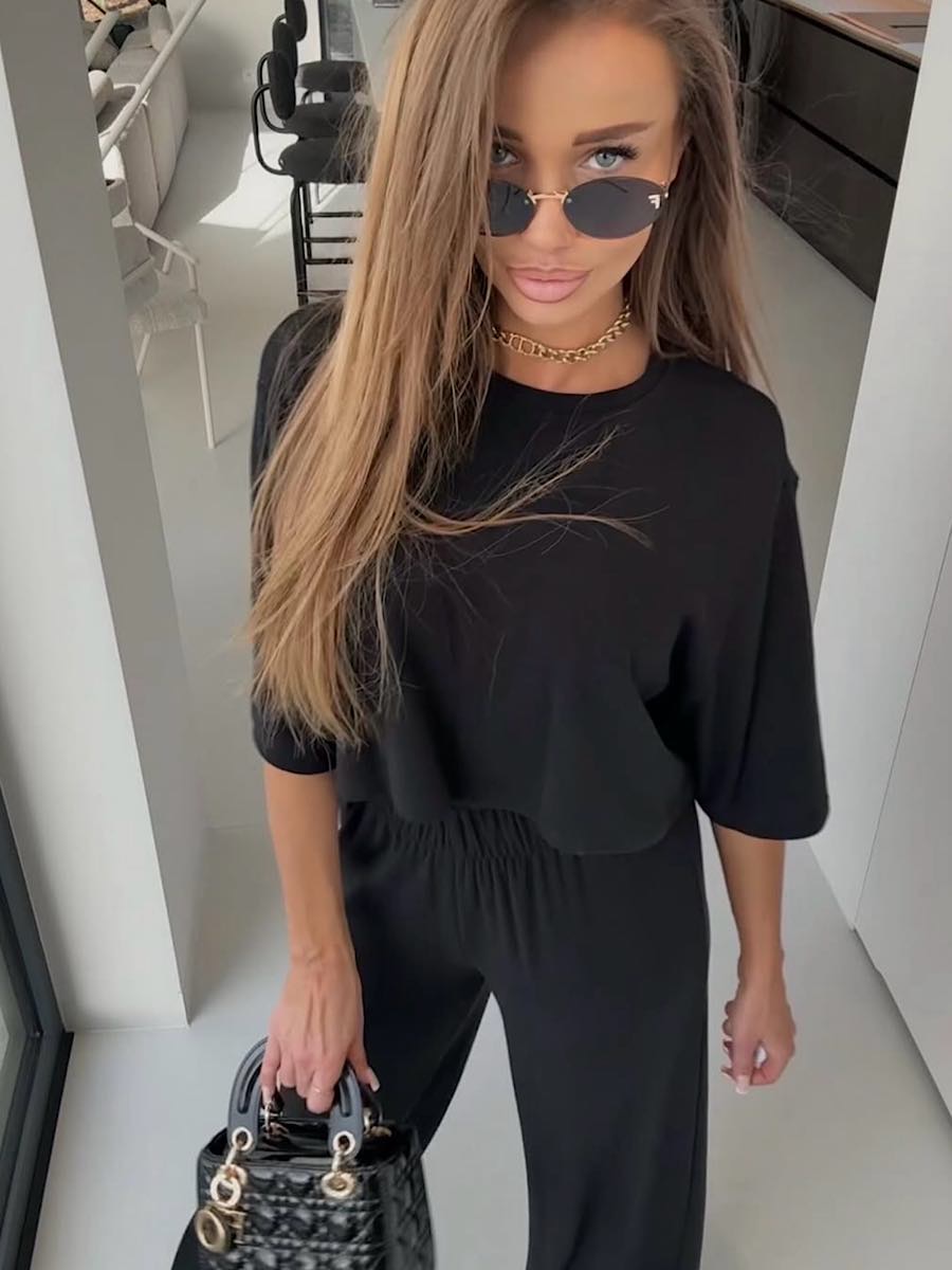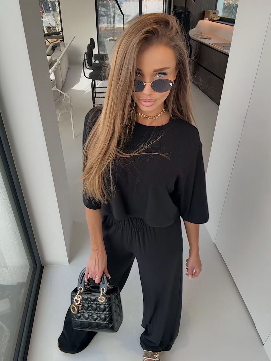 Stylowy, wygodny i absolutnie ponadczasowy – czarny komplet damski Agatha Fashion wykonany z wysokiej jakości wiskozy to idealna propozycja dla kobiet ceniących komfort w modnym wydaniu. Komplet składa się z krótkiego t-shirta o luźnym oversize’owym kroju. Bluzka posiada krótki rękaw i swobodną formę, dzięki czemu świetnie układa się na ciele i nadaje stylizacji nowoczesny, miejski charakter. Uzupełnieniem zestawu są spodnie z wysokim stanem, długą i szeroką nogawką, która optycznie wydłuża nogi i zapewnia maksymalną wygodę noszenia. Elastyczna talia gwarantuje idealne dopasowanie oraz komfort przez cały dzień. Całość została uszyta z wyjątkowo miękkiej, gładkiej i przyjemnej w dotyku tkaniny wiskozy. To materiał, który otula skórę, oddycha i sprawia, że komplet doskonale sprawdzi się zarówno na co dzień, jak i w stylizacjach homewear czy casual chic.
