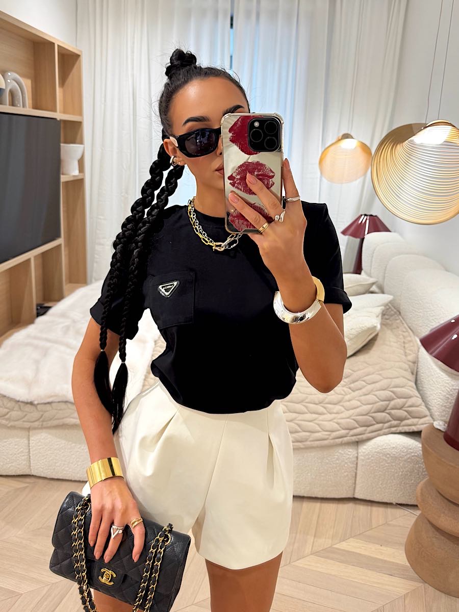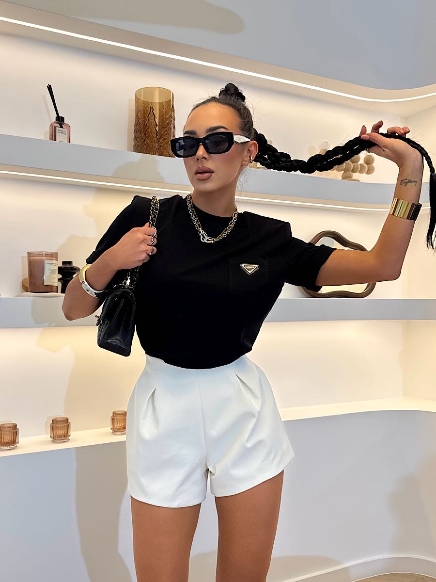 Czarny podkoszulek z ozdobną kieszonka na biuście.