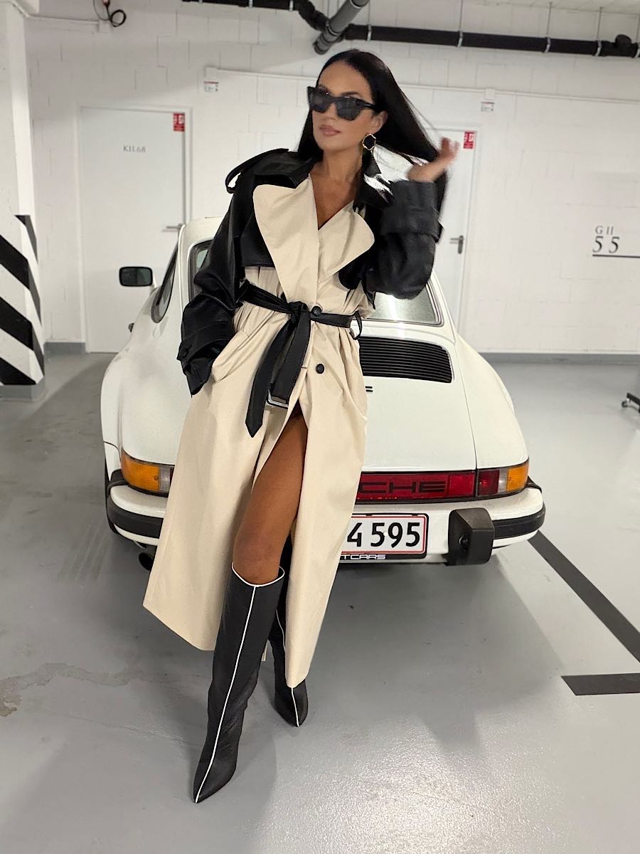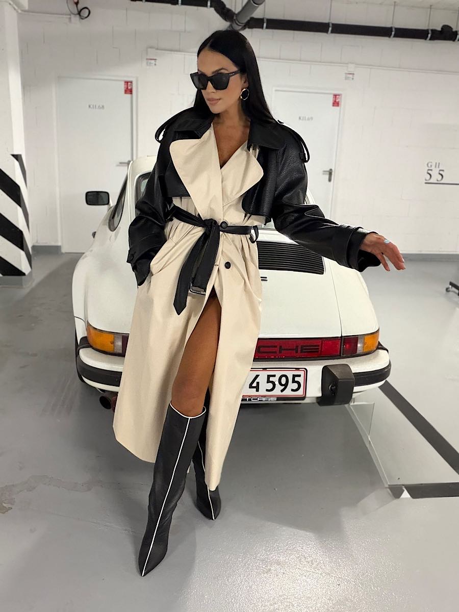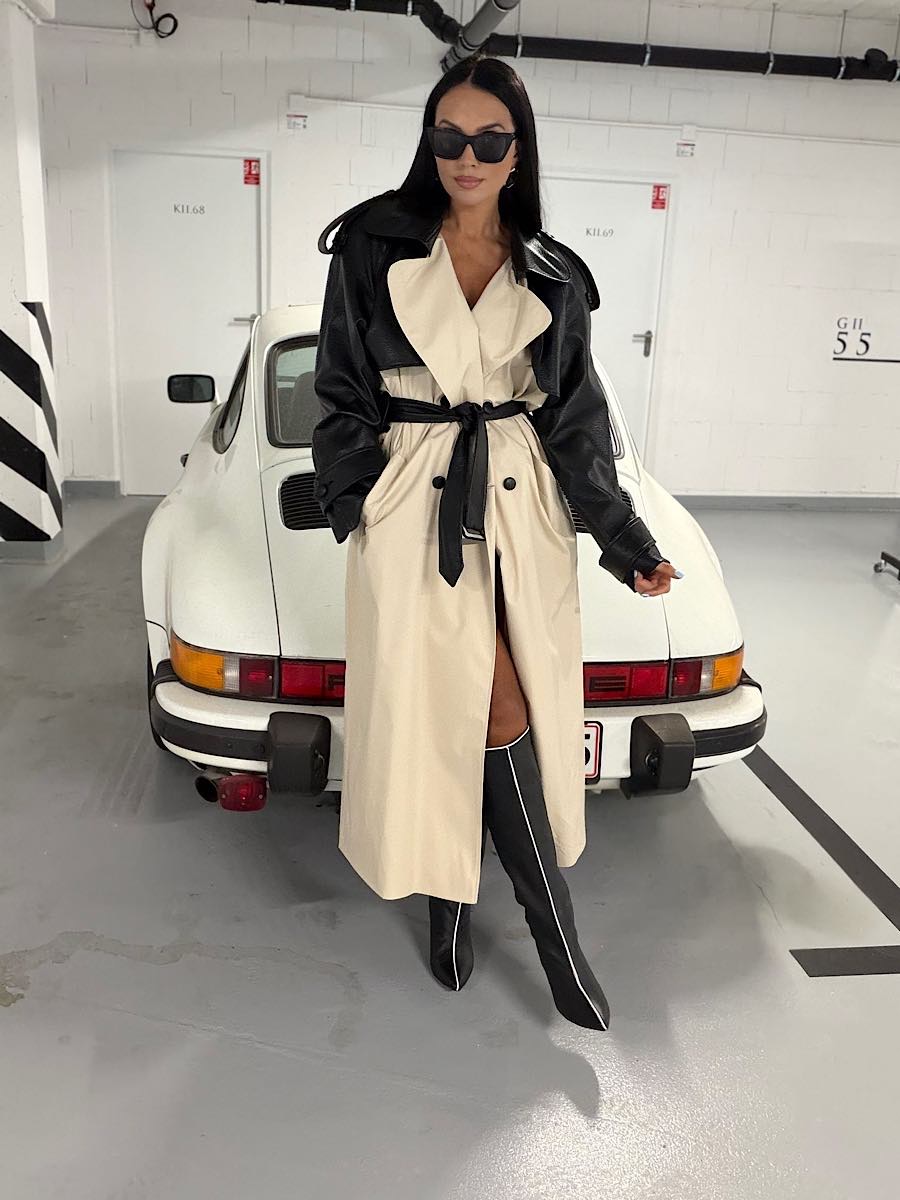 Długi trencz w odcieniu jasnego beżu połączonego z czarną eko skórą na rękawach i kołnierzu.