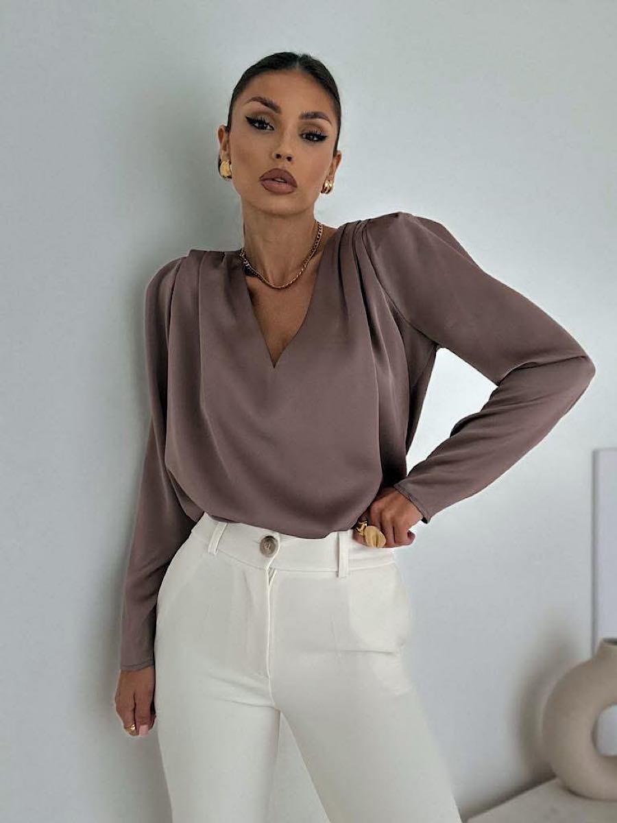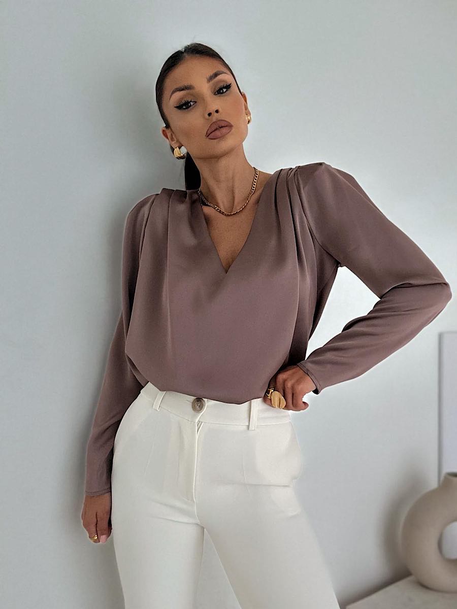 Stylowa i elegancka bluzka w kolorze delikatnej czekolady to propozycja dla kobiet ceniących ponadczasową klasykę. Wykonana z lekkiego, przyjemnego w dotyku materiału, pięknie układa się na sylwetce. Subtelne marszczenia na ramionach nadają jej wyjątkowego charakteru. Dekolt w kształcie litery V wysmukla szyję i dodaje kobiecości, dzięki czemu bluzka świetnie sprawdzi się zarówno w codziennych, jak i wieczorowych stylizacjach. Połączysz ją z eleganckimi spodniami i spódnicami jak również z klasycznymi jeansami.