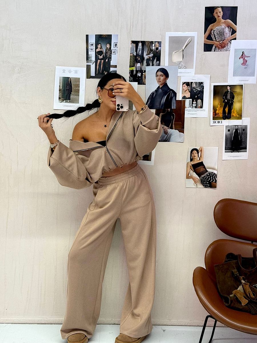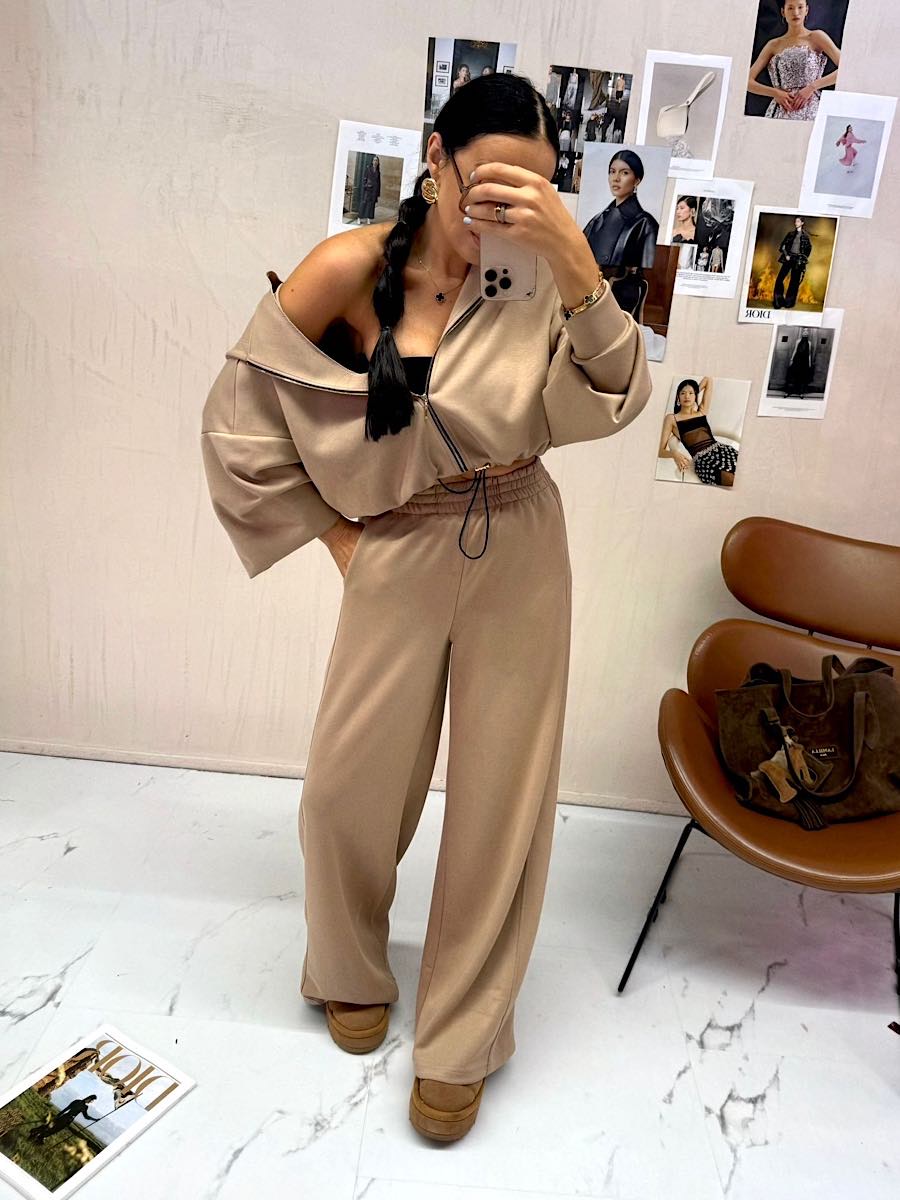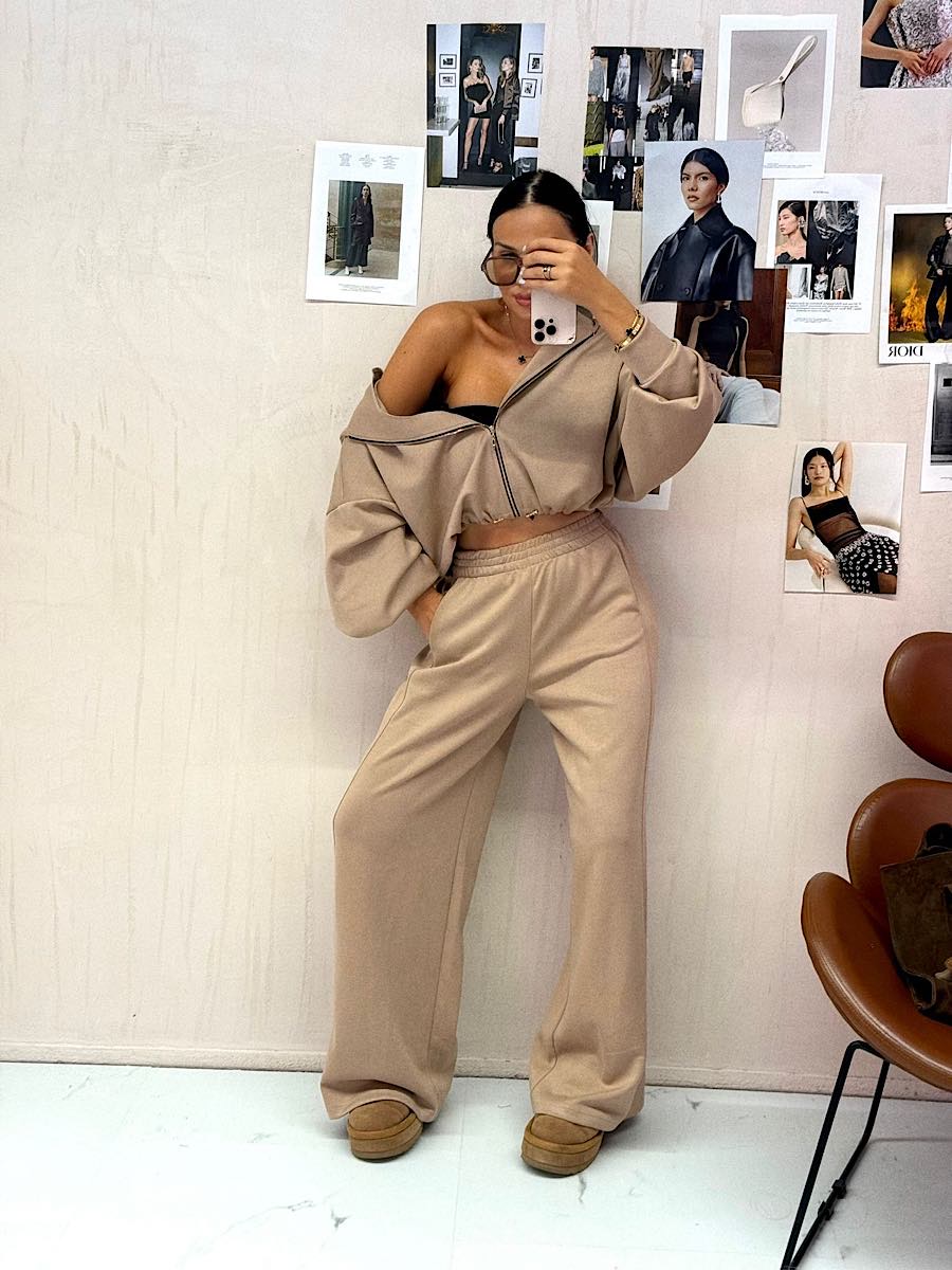 Tagi: jesienna stylizacja, karmel, komplet, luźny komplet, modny beż, sportowa stylizacja, wiskoza