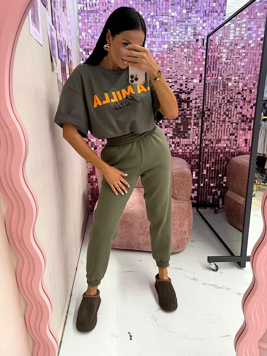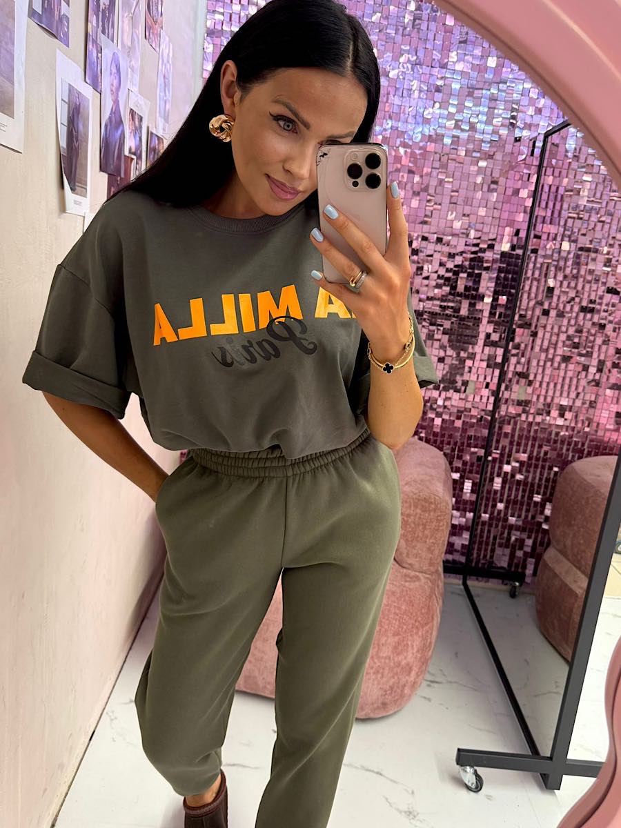 Khaki T-shirt LaMilla Paris z żółtym logo.