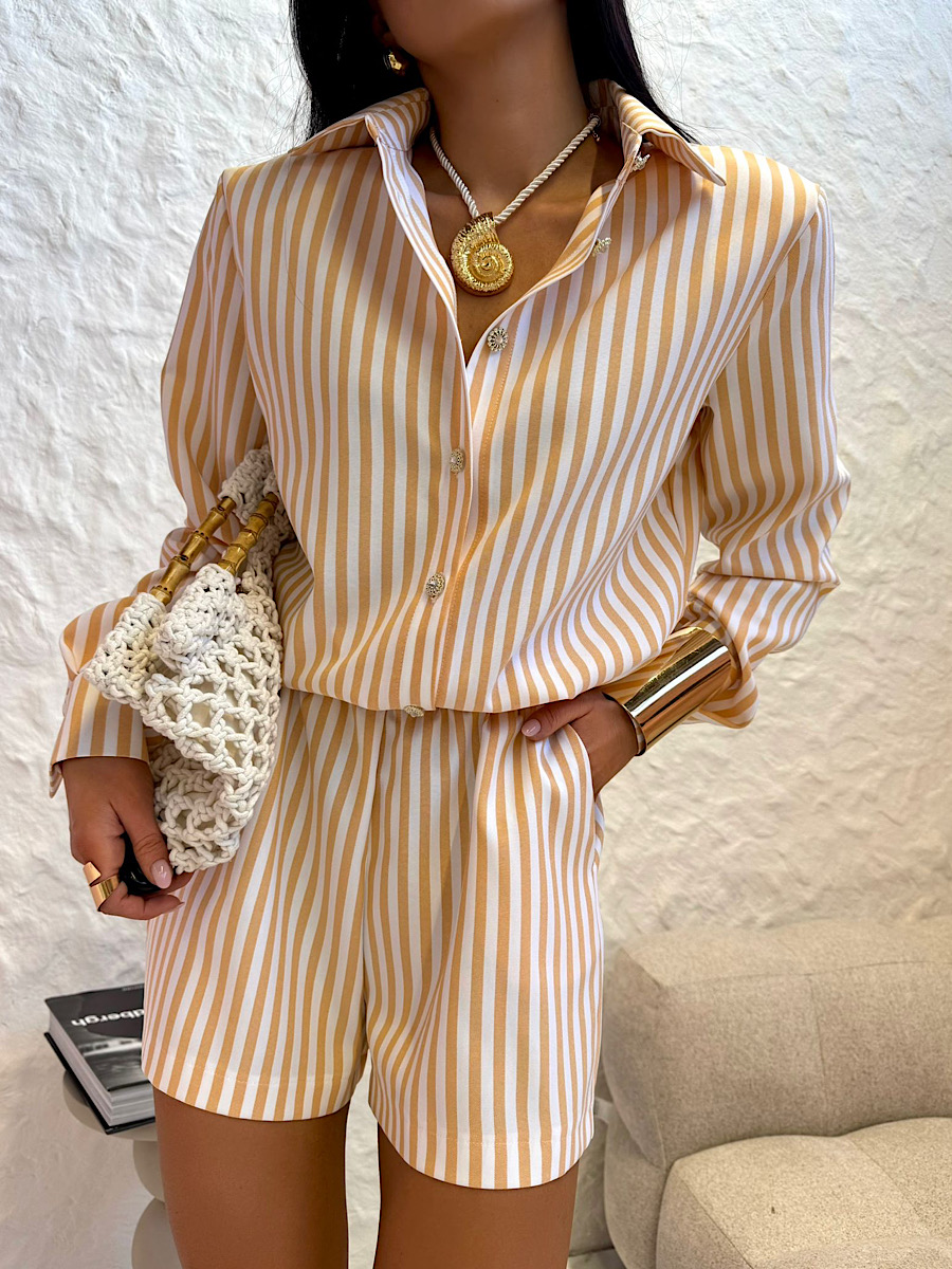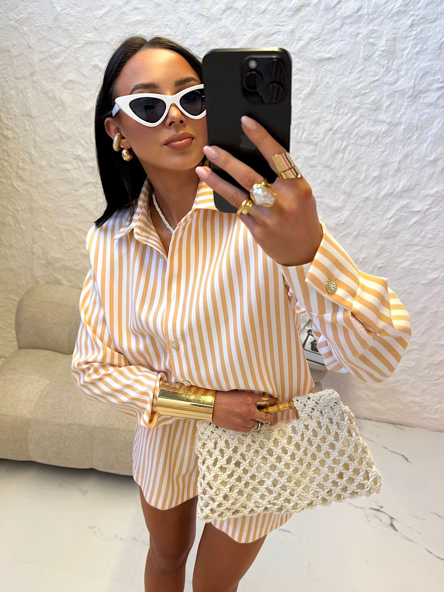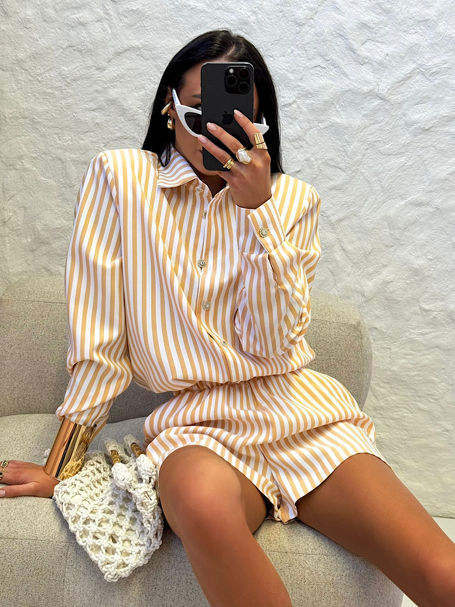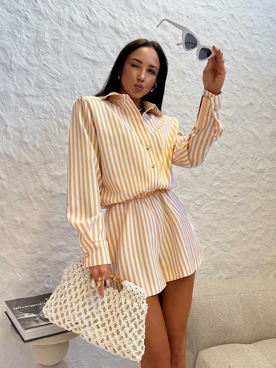 Modne , pionowe paski w odcieniu bieli i jasnej pomarańczy optycznie wydłużają sylwetkę i nadają całości świeżego, wakacyjnego charakteru.