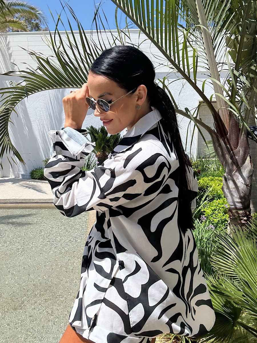 Koszula w oversizowym, luźnym fasonie, pasująca do wielu innych stylizacji z jeansami lub spodenkami.