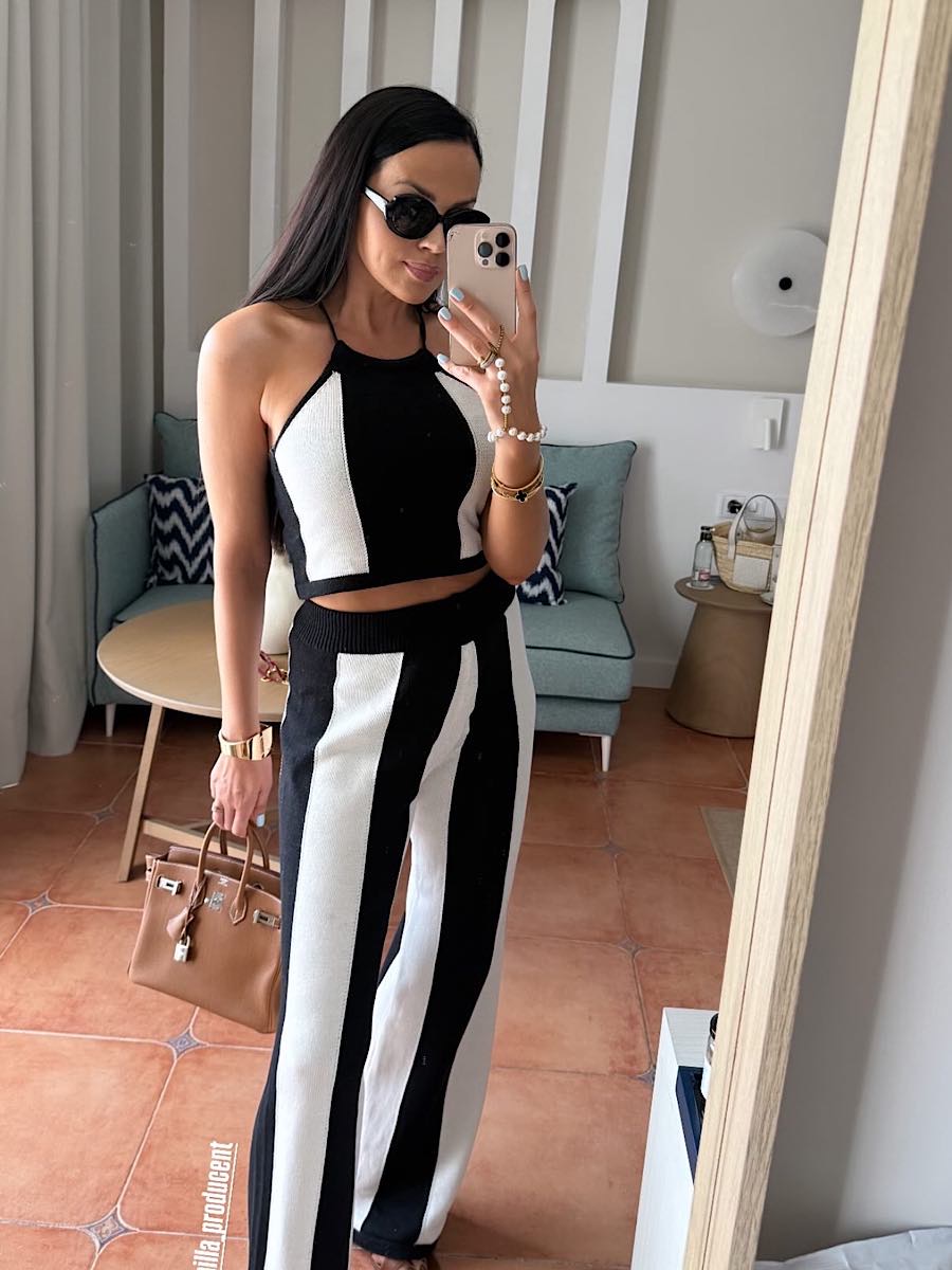 Komplet składa się z długich spodni i topu. Spodnie z szeroką, długą nogawką i czarnym ściągaczem w talii. Top typu halter z wycięciami na ramionach, wiązany w tylnej części bluzki. Pokochasz go za klasyczną elegancję w nowoczesnym wydaniu.