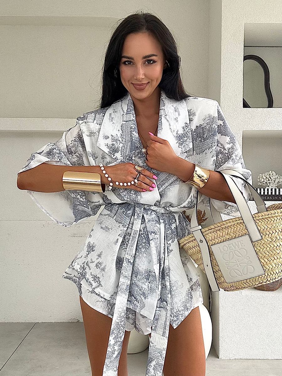 Komplet Lniany Dior LaMilla – kimono i spodenki w szarym wzorze