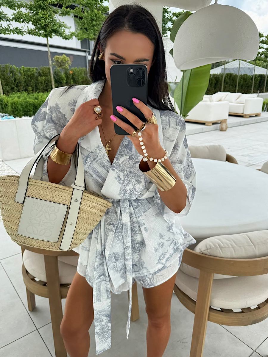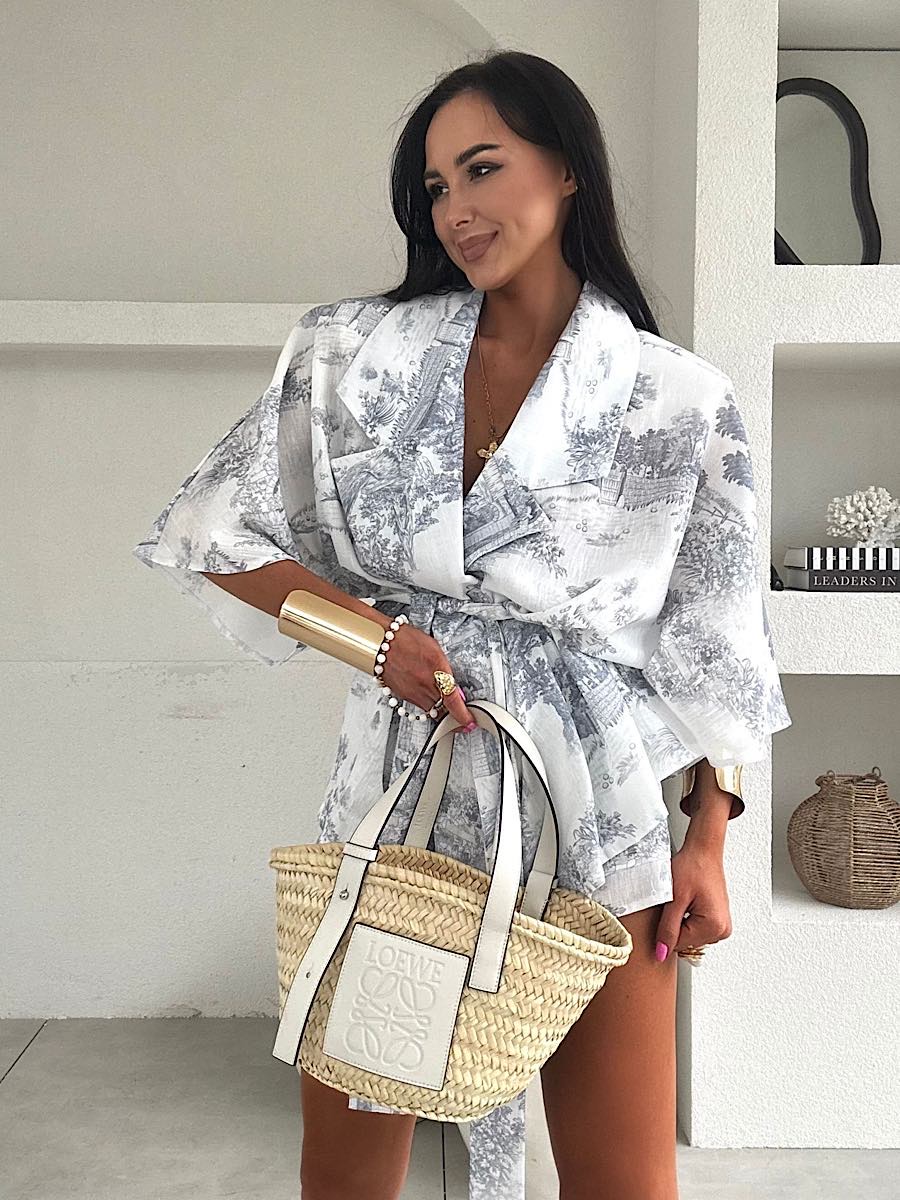 Składa się z szortów oraz kimona w tym samym efektownym wzorze.
