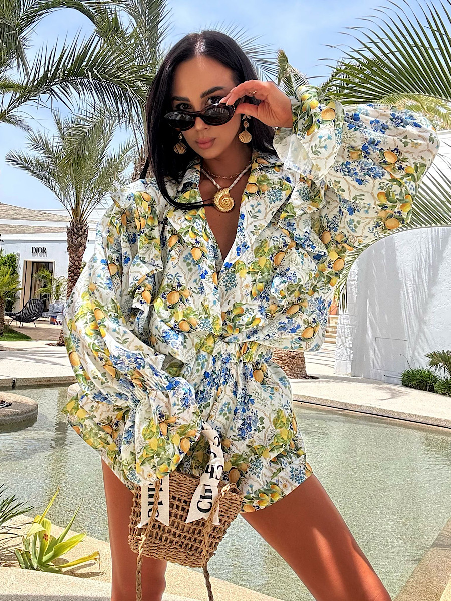 Komplet Lniany Dior LaMilla – spodenki i koszula we wzorze żółtych cytrynek i niebieskich kwiatów
