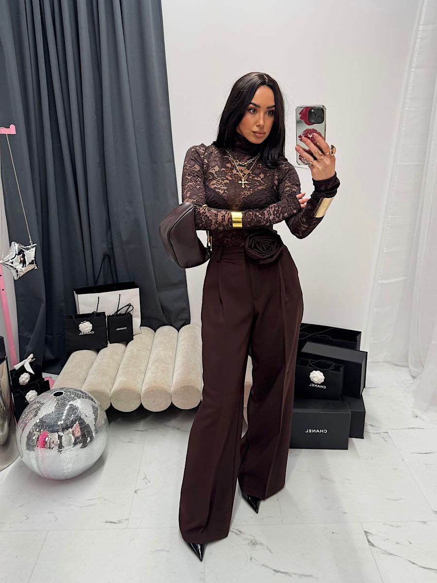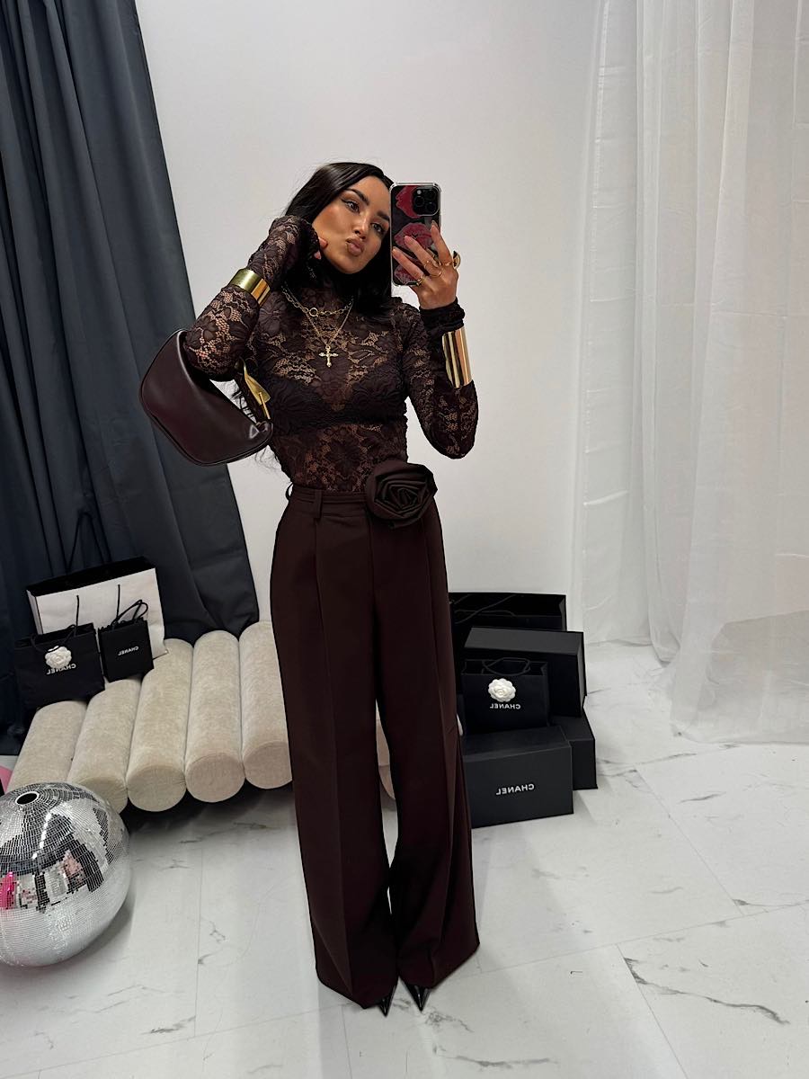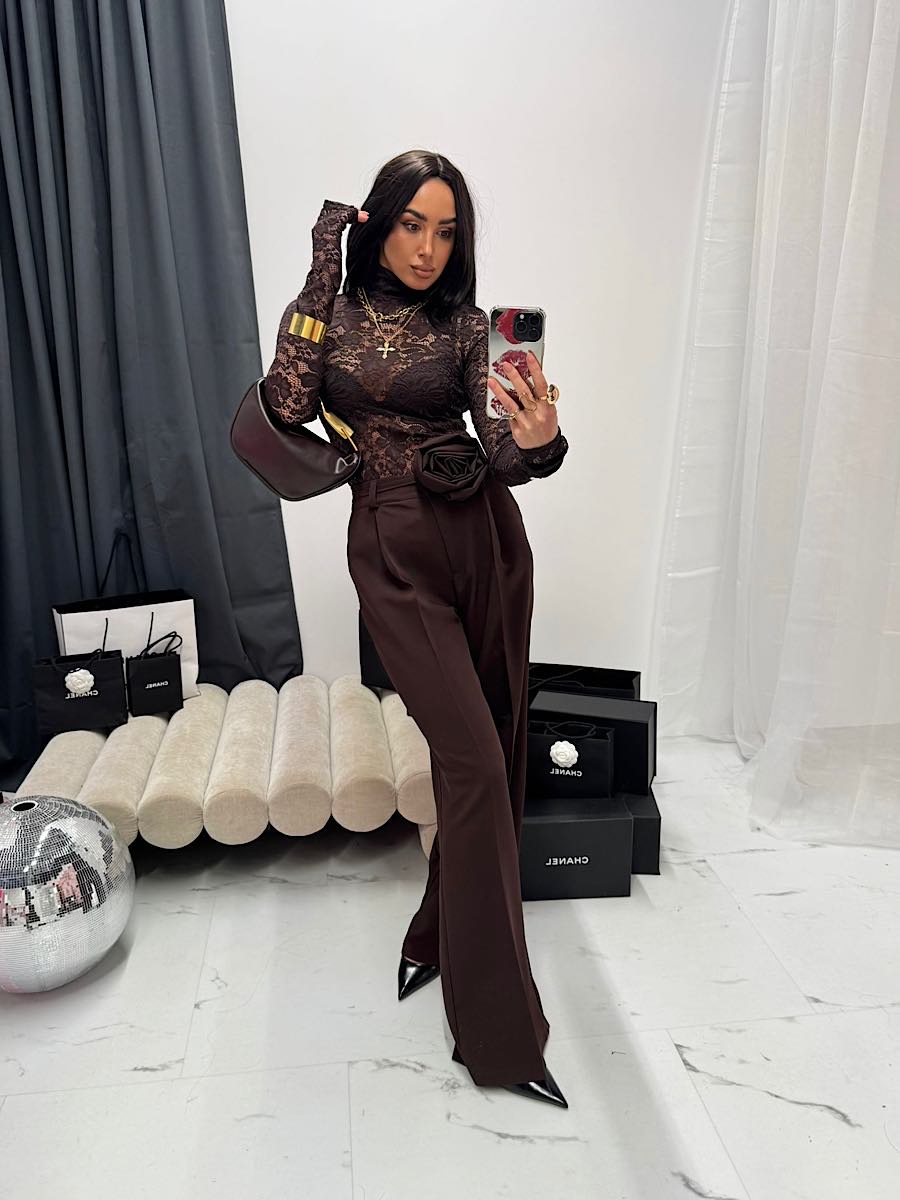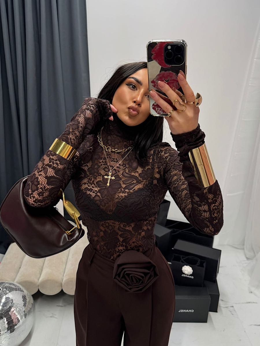 Koronka we wzorze kwiatowym nadaje jej eleganckiego wyglądu a brązowy kolor przykuwa uwagę.