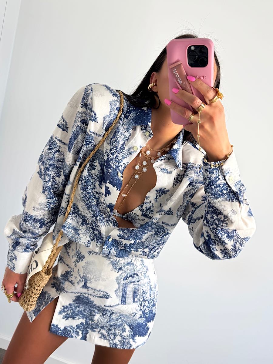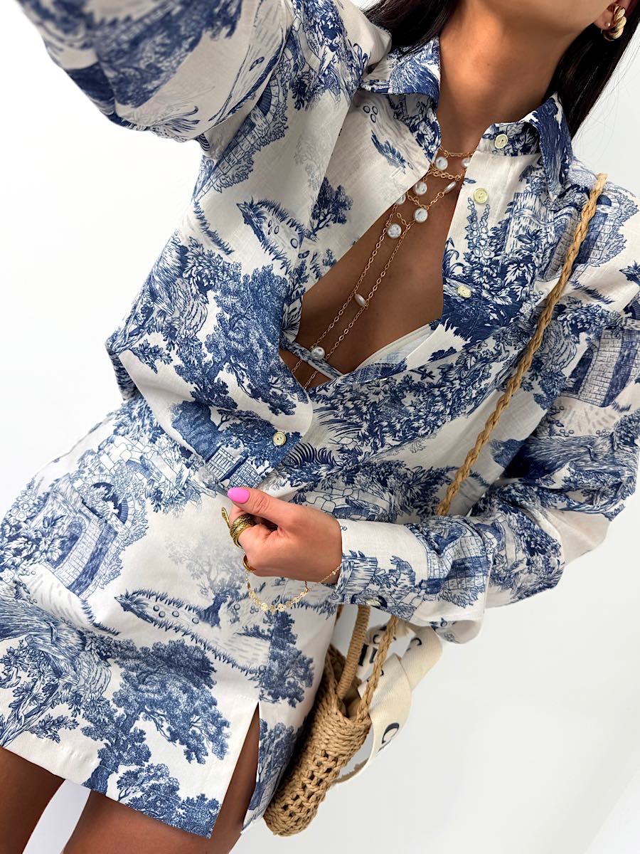 Długi rękaw zakończony mankietem zapinanym na złoty guzik. Przy szyi delikatny kołnierzyk. Zapinana na drobne, złote guziki. Przedłużany, oversizowy fason. Połącz ją ze spodniami lub spodenkami LaMilla w tym samym wzorze i stwórz piękny total look.