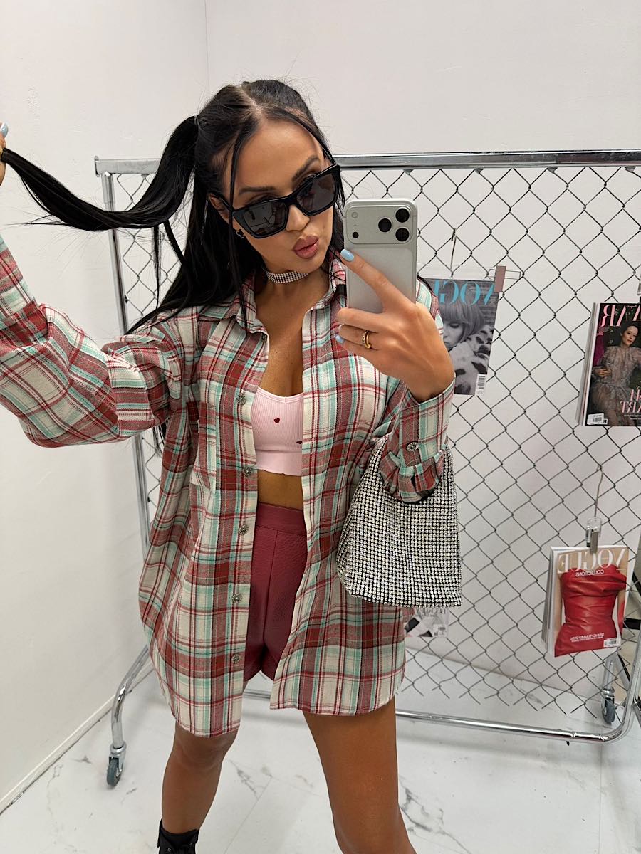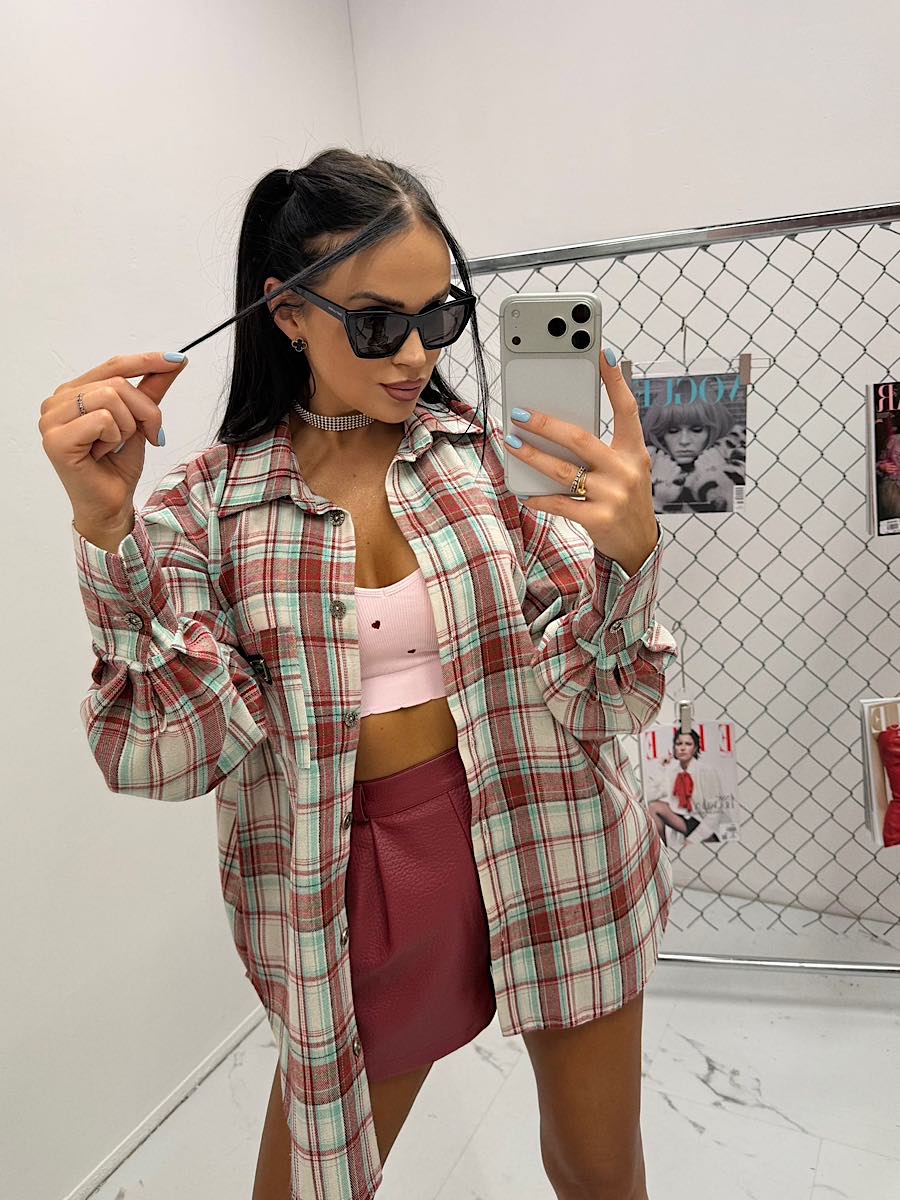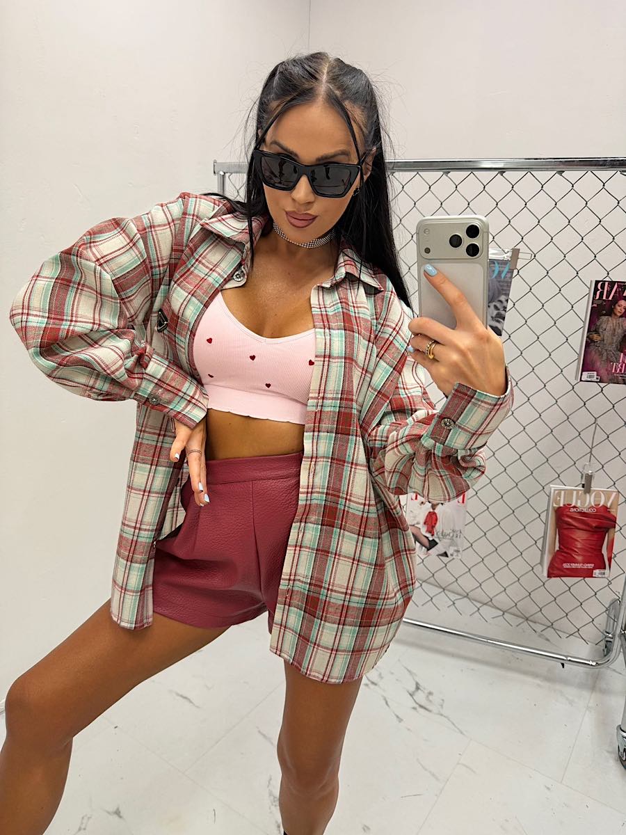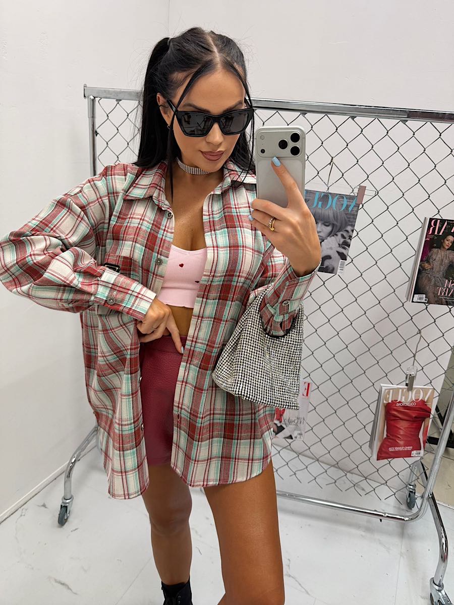 Koszula w bordowo zieloną kratę z czarnym minimalistycznym logo LaMilla.