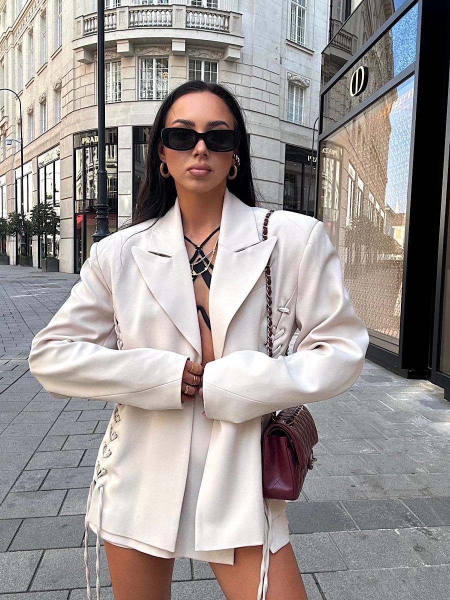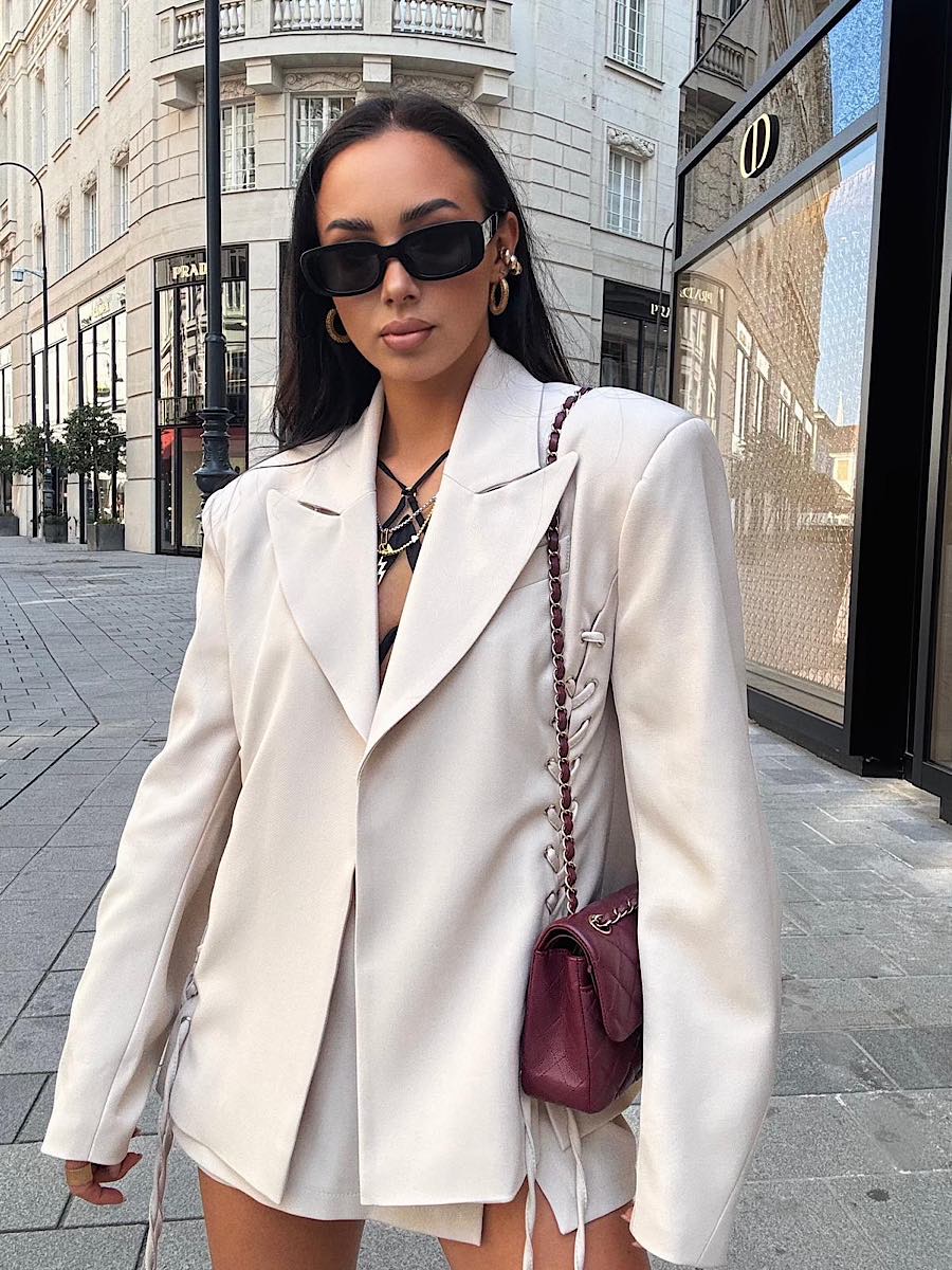 Tagi: elegancka marynarka, elegancka moda, kremowa marynarka, marynarka, marynarke ze sznurowaniem, oversizowa marynarka