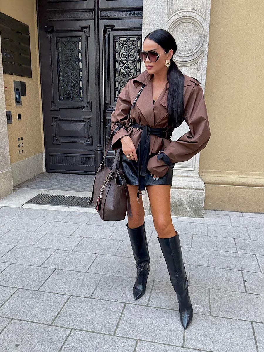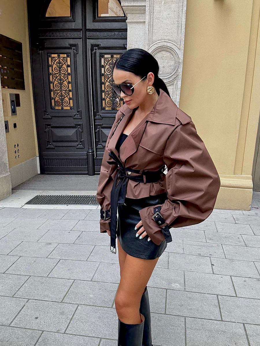 Krótki płaszcz LaMilla Premium typu trencz w kolorze brązowym z czarnymi dodatkami.