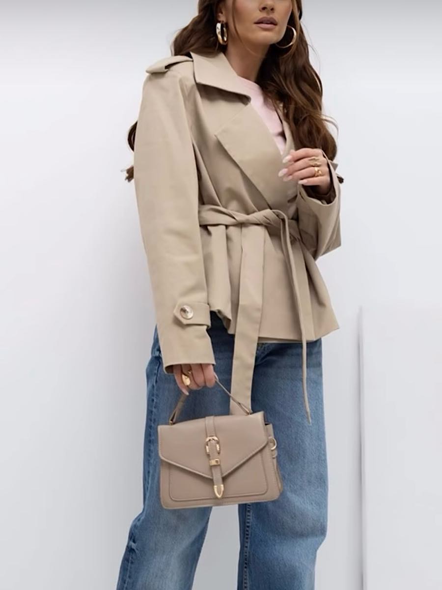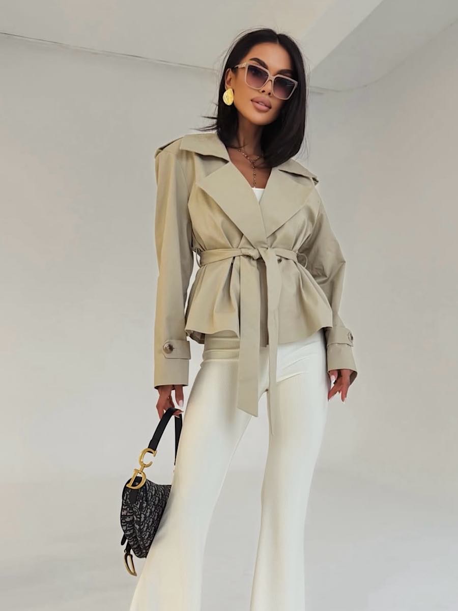 Krótka kurtka w stylu trencza łącząca klasyczny fason płaszcza z nowoczesnością i wygodą kurtki. Zapinana dwurzędowo na duże ozdobne guziki. Na ramionach posiada delikatne poduszki i pagony. Długi rękaw wykończony na dole patką z guzikiem. W talii posiada pasek do wiązania aby podkreślić kobiece kształty. Kurteczka wykonana z wysokiej jakości bawełny, zapewniającej komfort noszenia przez cału dzień. Stylowa propozycja odzieży wierzchniej na wiosenne i jesienne dni.