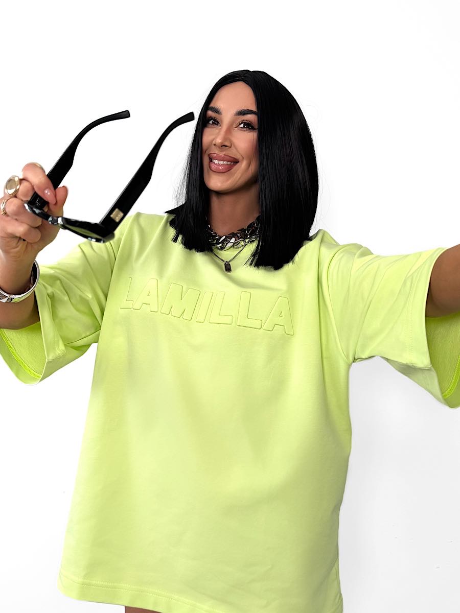 Wytłaczany napis LaMilla pięknie odbija się od limonkowego tła podkoszulki.