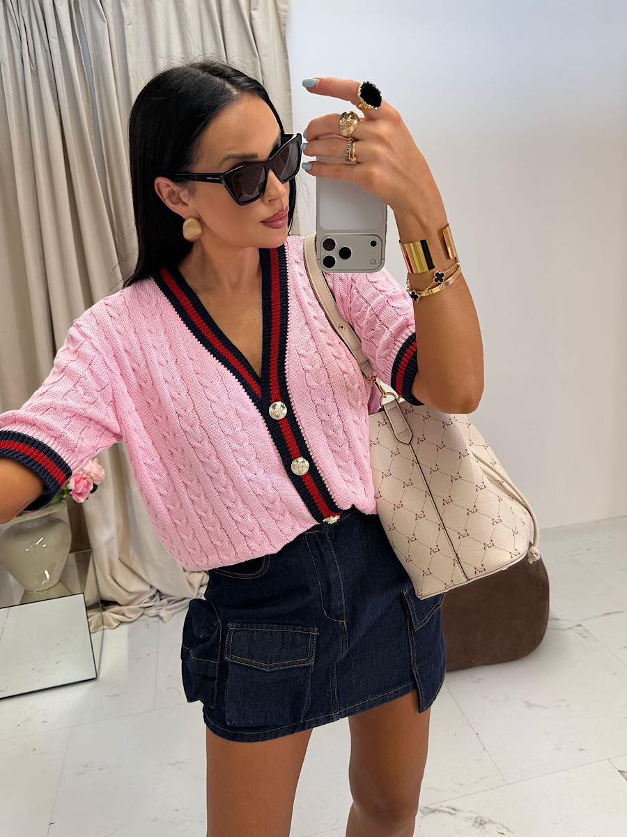Elegancki i ponadczasowy sweterek damski marki LaMilla to idealna propozycja dla kobiet ceniących elegancję w codziennych stylizacjach. Model wykonany z wysokiej jakości przędzy, zawierającej 70 % wełny oraz 30 % akrylu, zapewnia komfort noszenia, miękkość oraz doskonałe dopasowanie do sylwetki. Sweterek wyróżnia się subtelnym splotem warkoczowym, który nadaje mu klasycznego, a zarazem modnego charakteru. Krótki rękaw sprawia, że jest to idealny wybór na każdy sezon w ciągu roku. Dekolt w kształcie litery V oraz kontrastowa lamówka w kolorze granatowo – czerwonym podkreślają elegancki styl i dodają całości wyjątkowego wyrazu. Model zapinany jest na efektowne, złote guziki, które stanowią stylowy detal i podnoszą walory estetyczne sweterka.