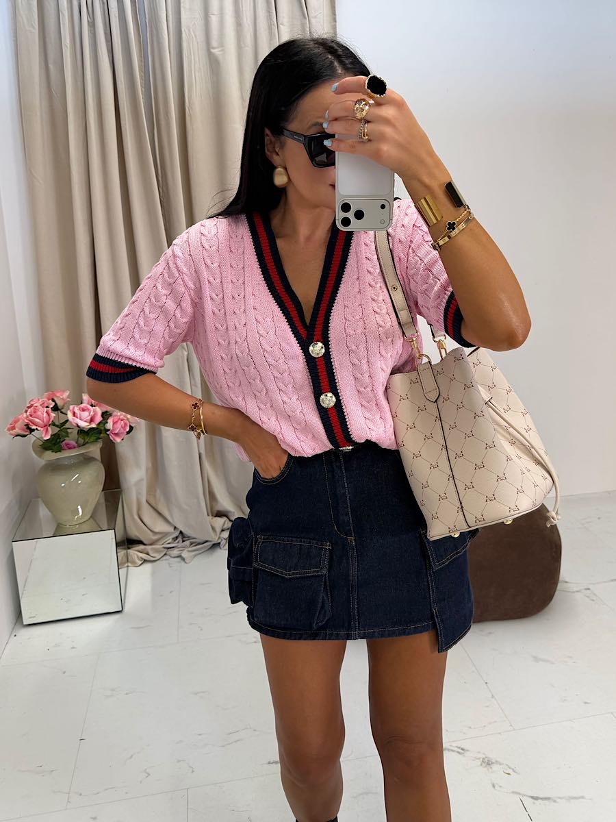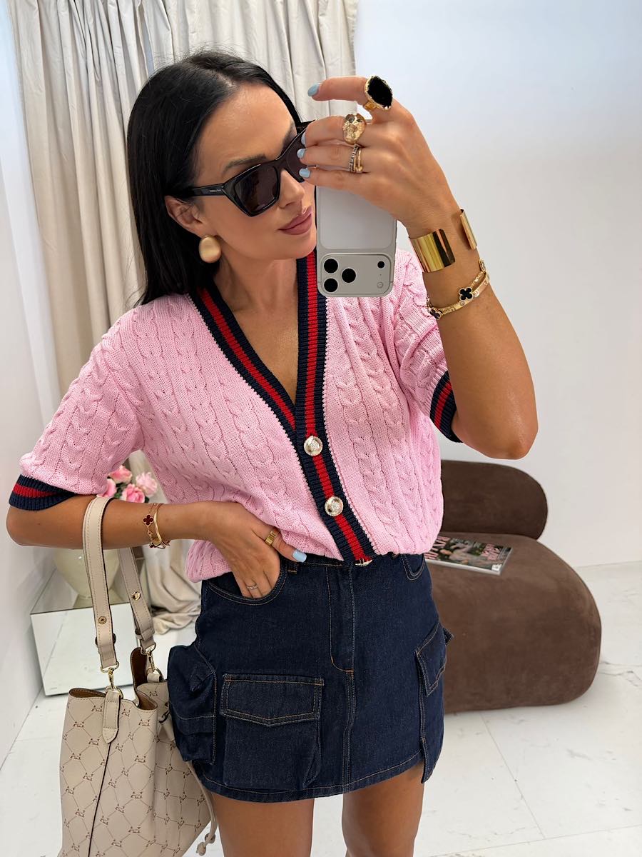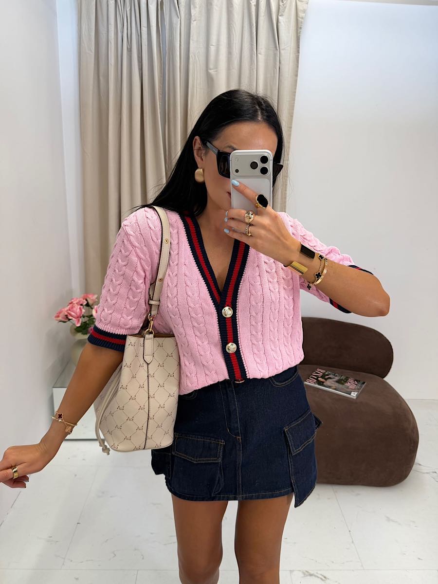 Różowy Sweter LaMilla z czerwono granatowym lampasem