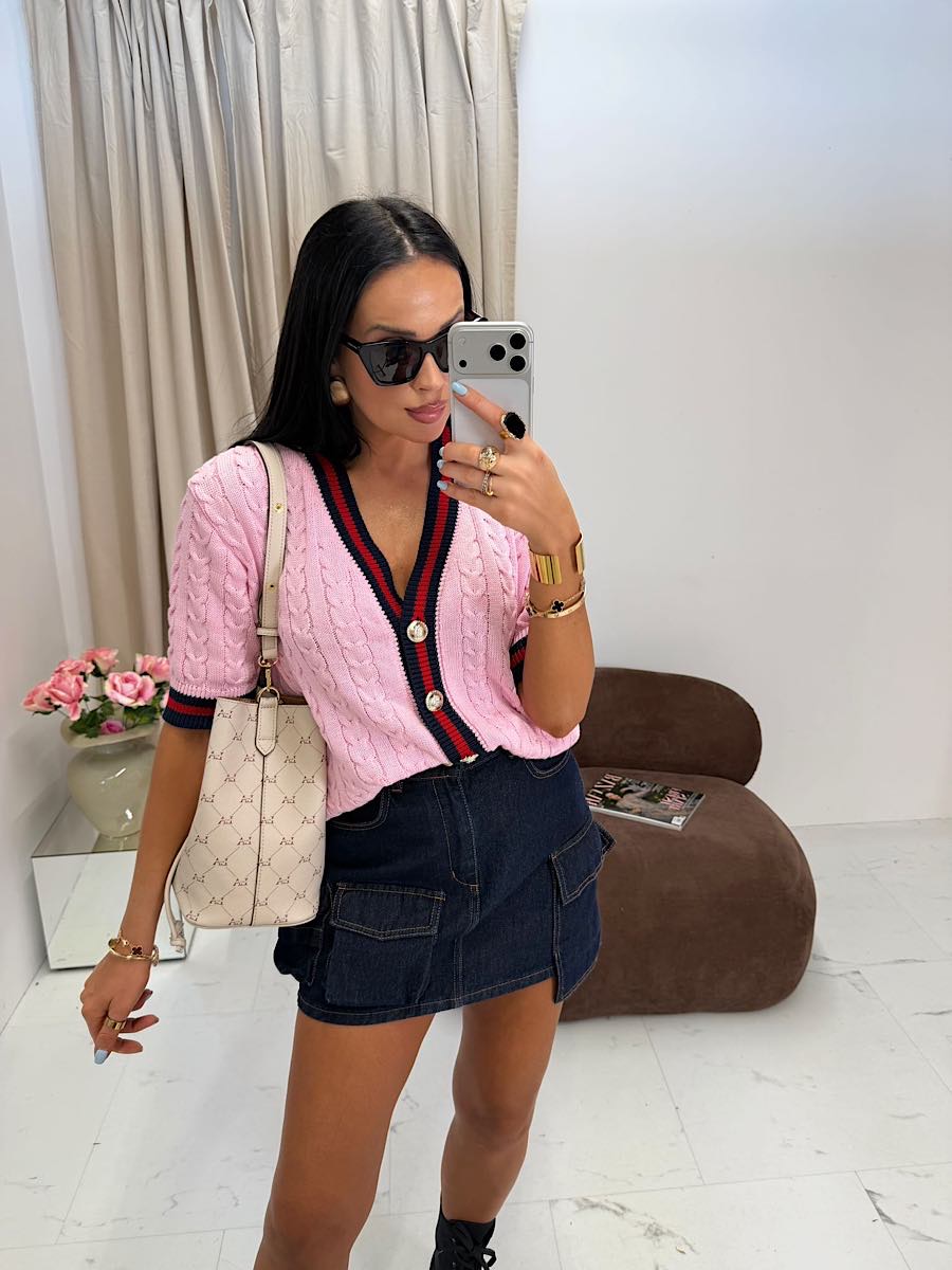 Rożowy sweter LaMilla z czerwono – granatowym lampasem.