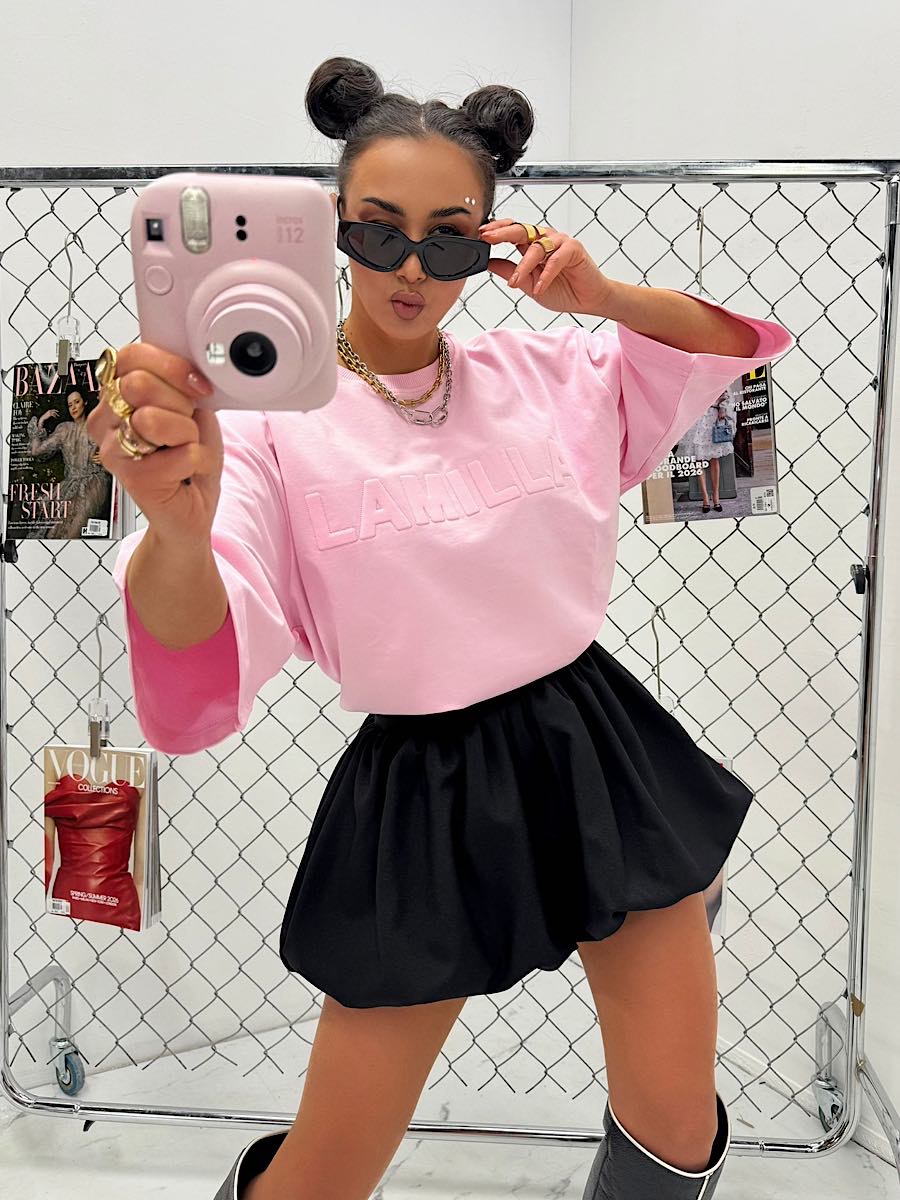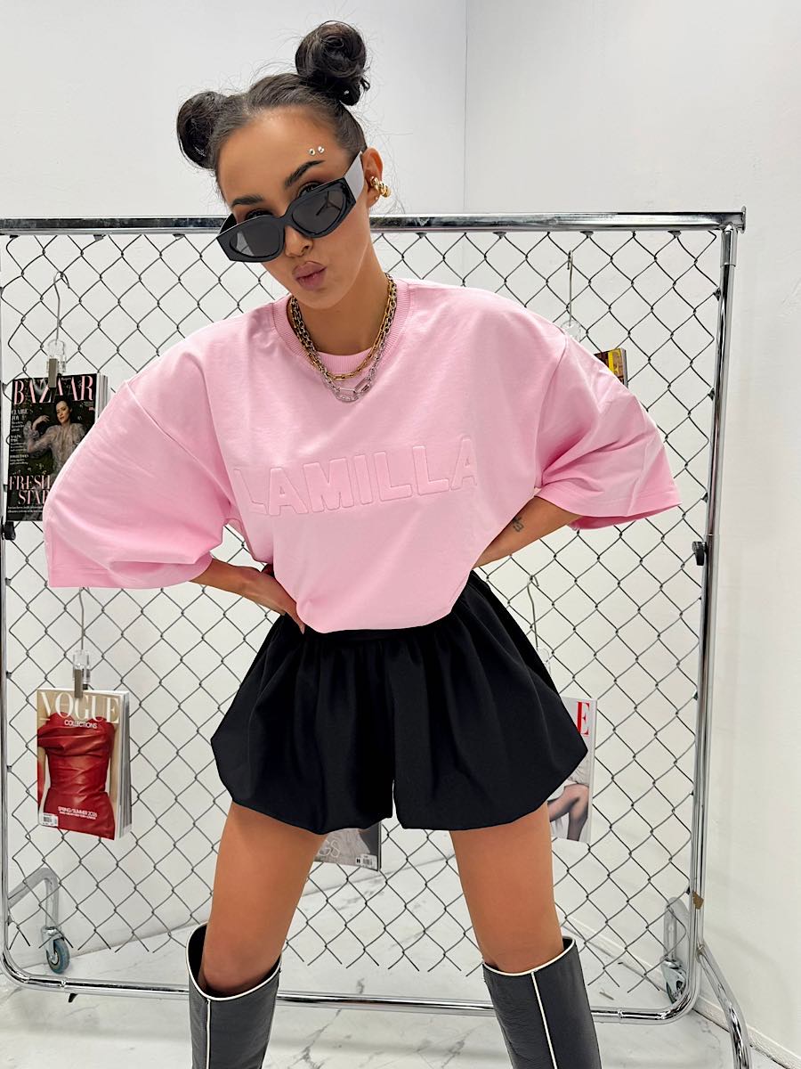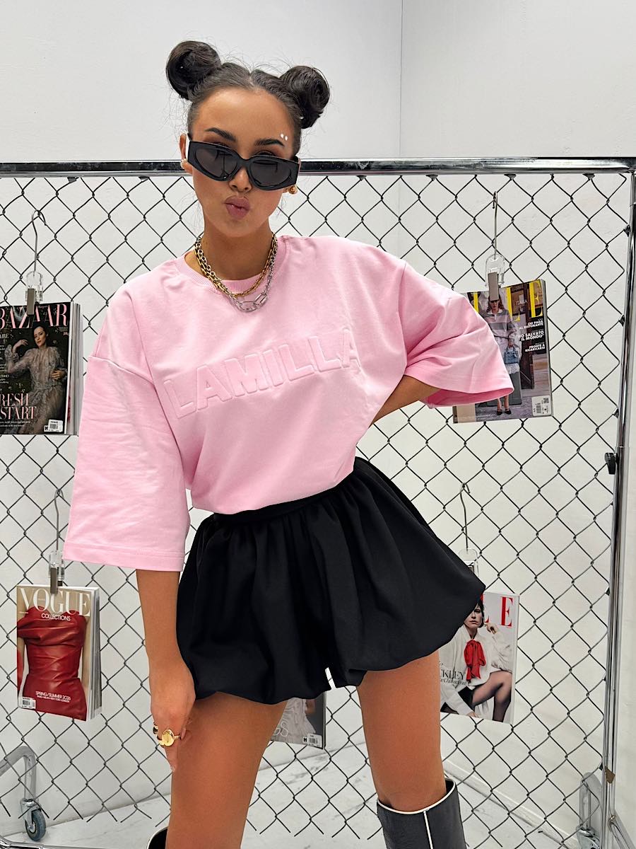 Wytłaczany napis LaMilla pięknie odbija się od różowego tła podkoszulki.