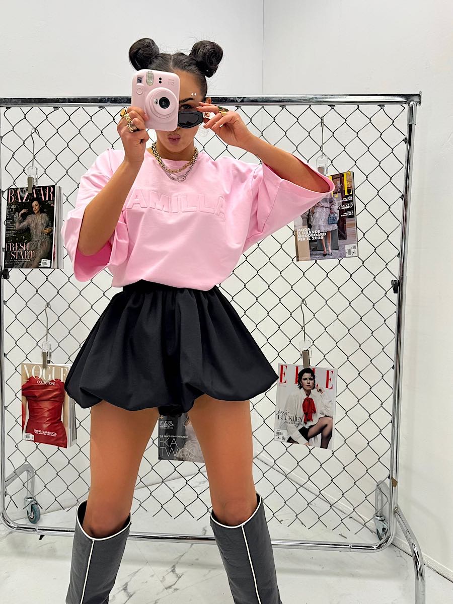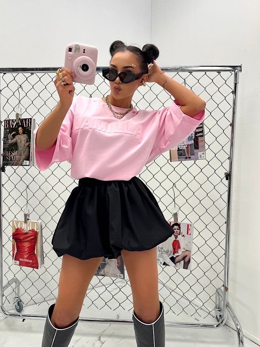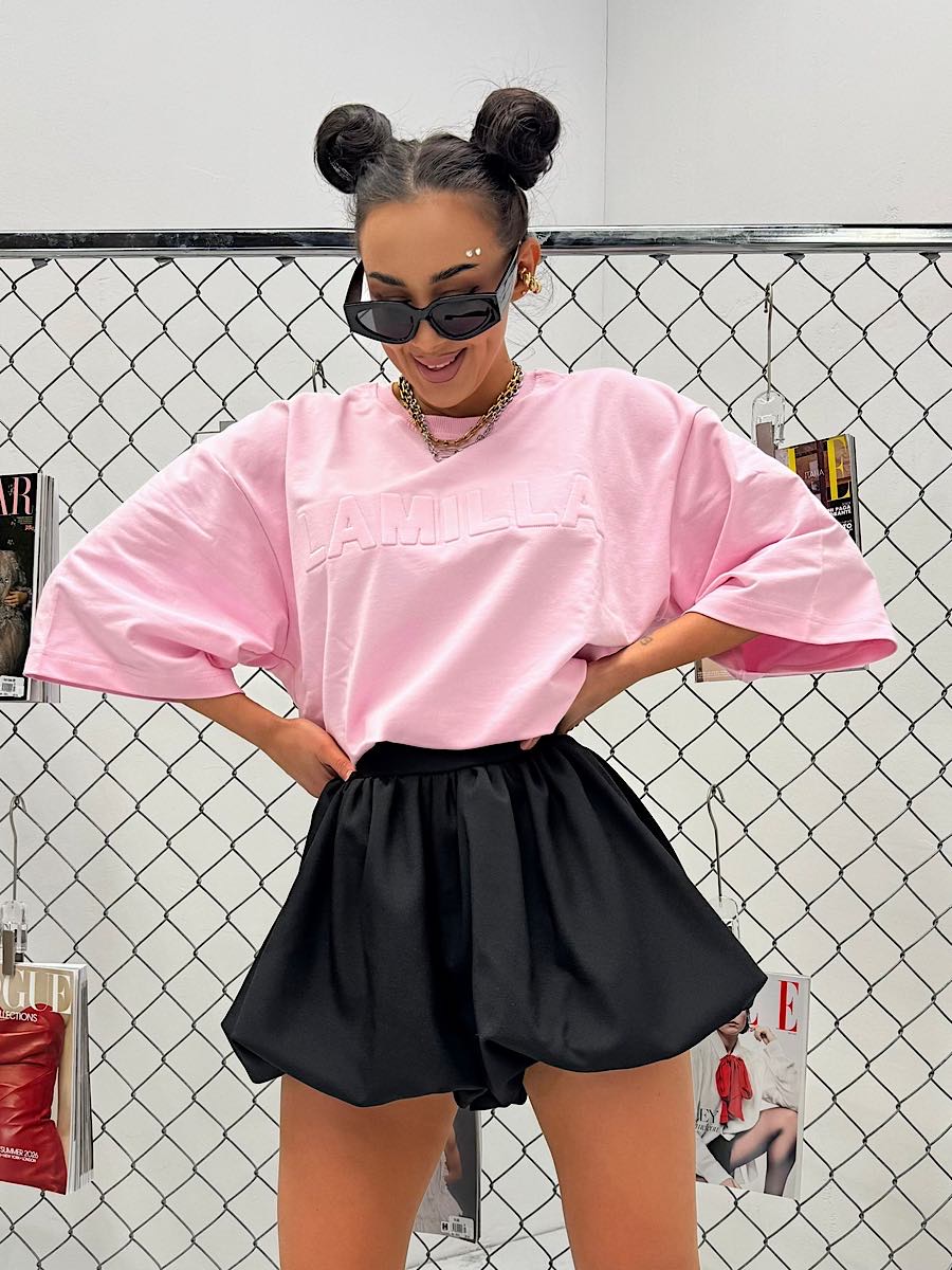 Wytłaczany napis LaMilla pięknie odbija się od różowego tła podkoszulki.