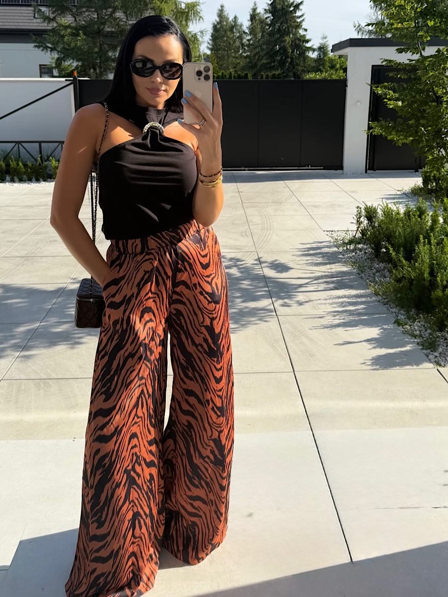 Tagi: boczne rozcięcia na nogawce, eleganckie spodnie, spodnie, spodnie w zwierzęcym wzorze, szerokie spodnie, tygrysi wzór