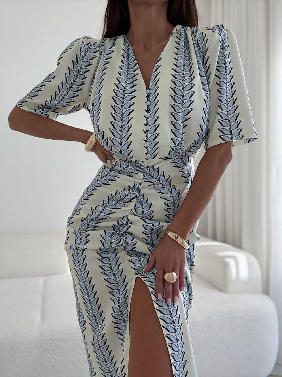 Dekolt w klasyczną V, marszczenie zakończone rozcięciem na środku.