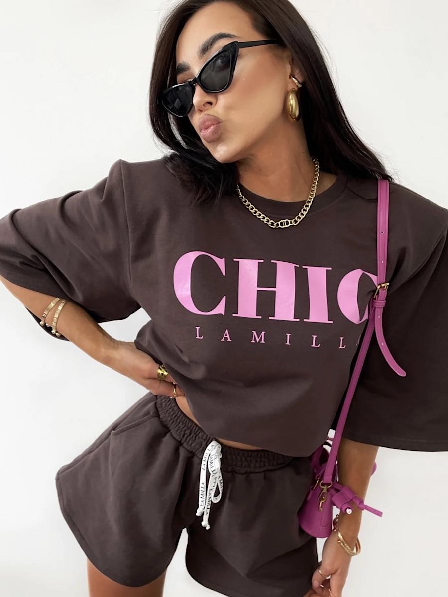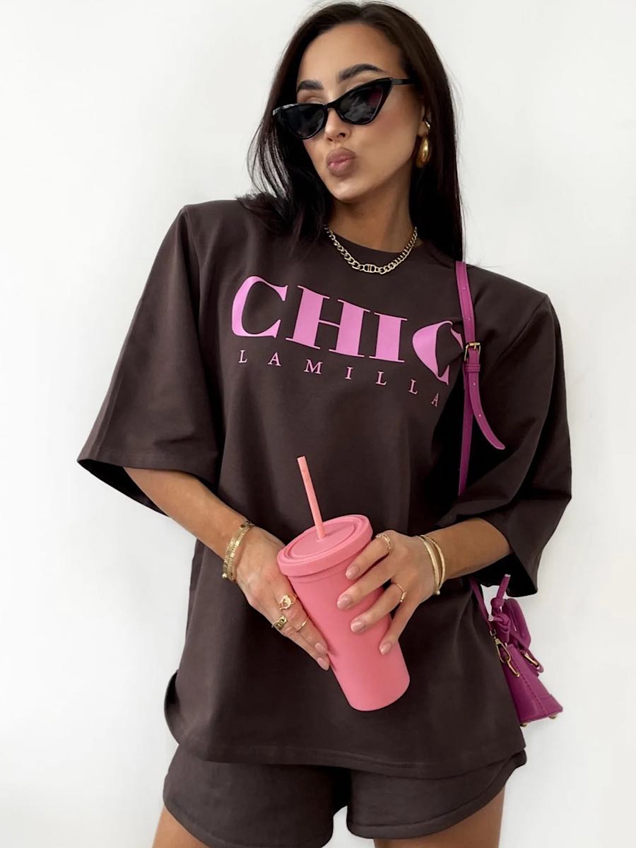 Różowy nadruk Chic pięknie odbija się od brązowego tła podkoszulki.