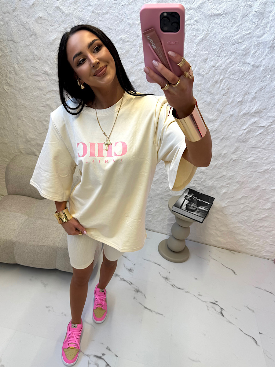 Różowy nadruk Chic pięknie odbija się od kremowego tła podkoszulki.