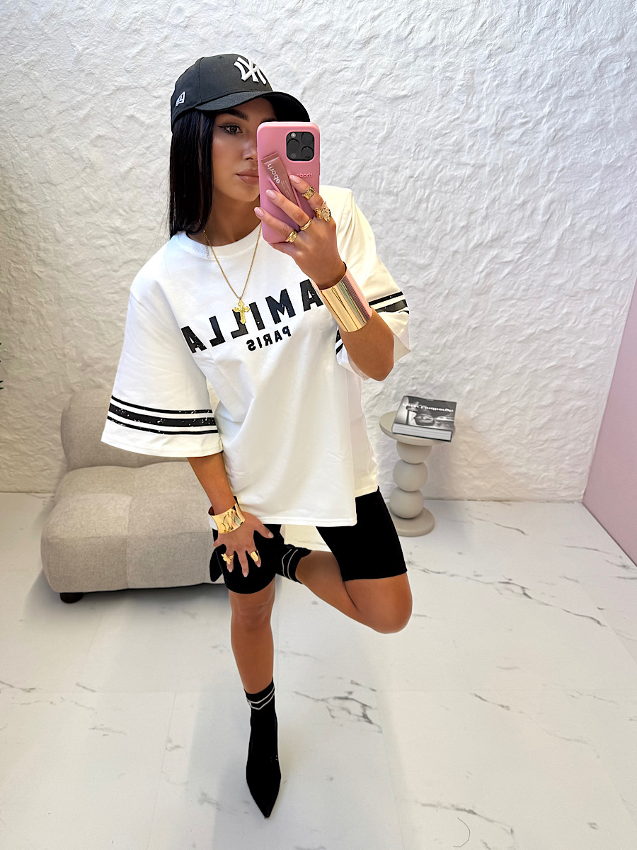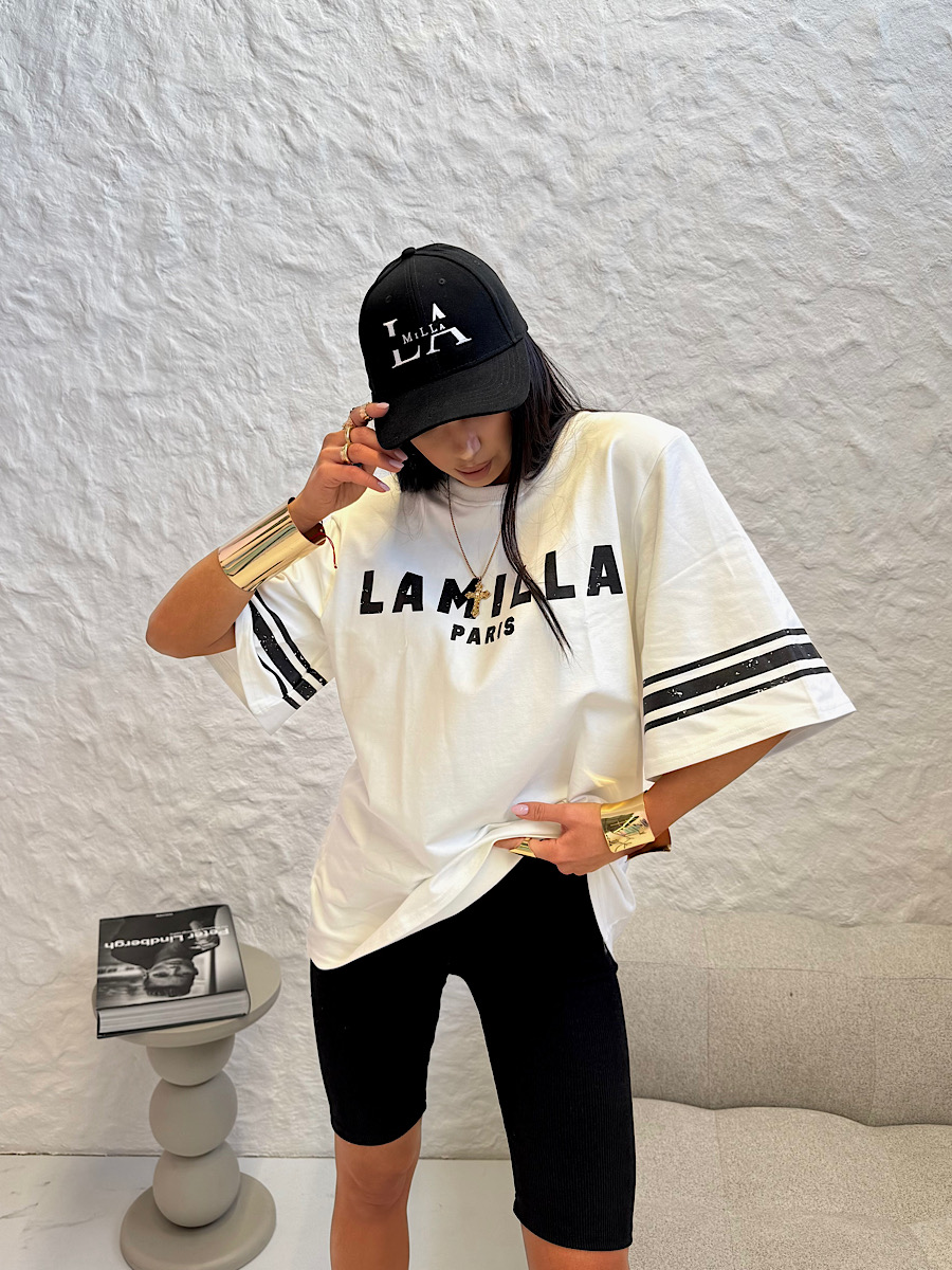 Czarny nadruk LaMilla Paris pięknie odbija się od białego tła podkoszulki.
