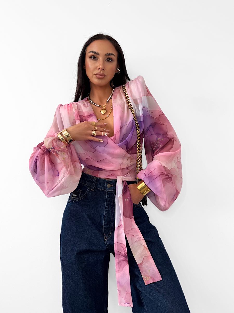 Wiązana bluzka LaMilla w różowo – fioletowe kwiaty.