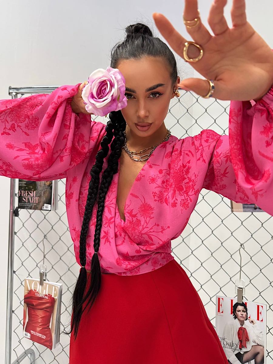 Wiązana bluzka LaMilla w czerwone kwiaty na różowym tle