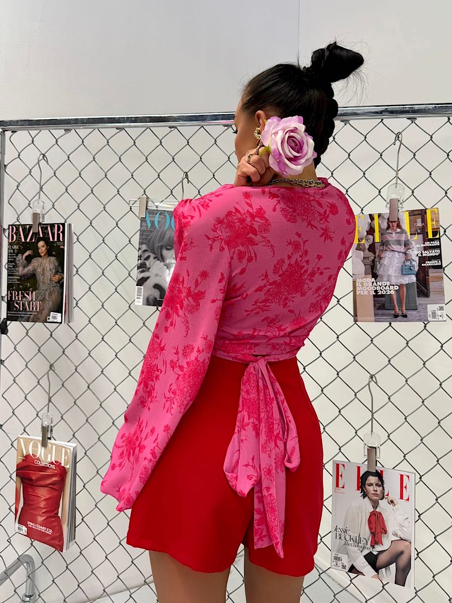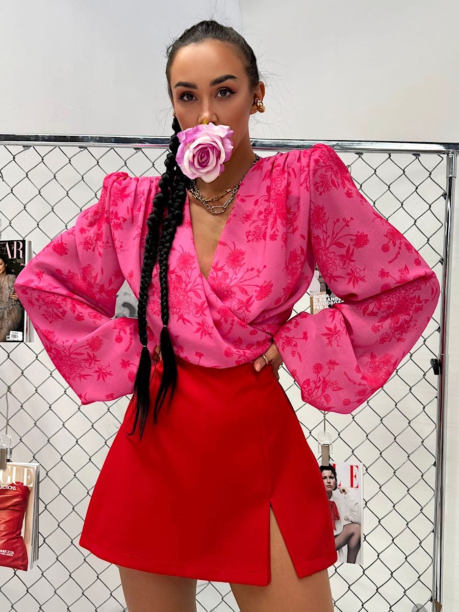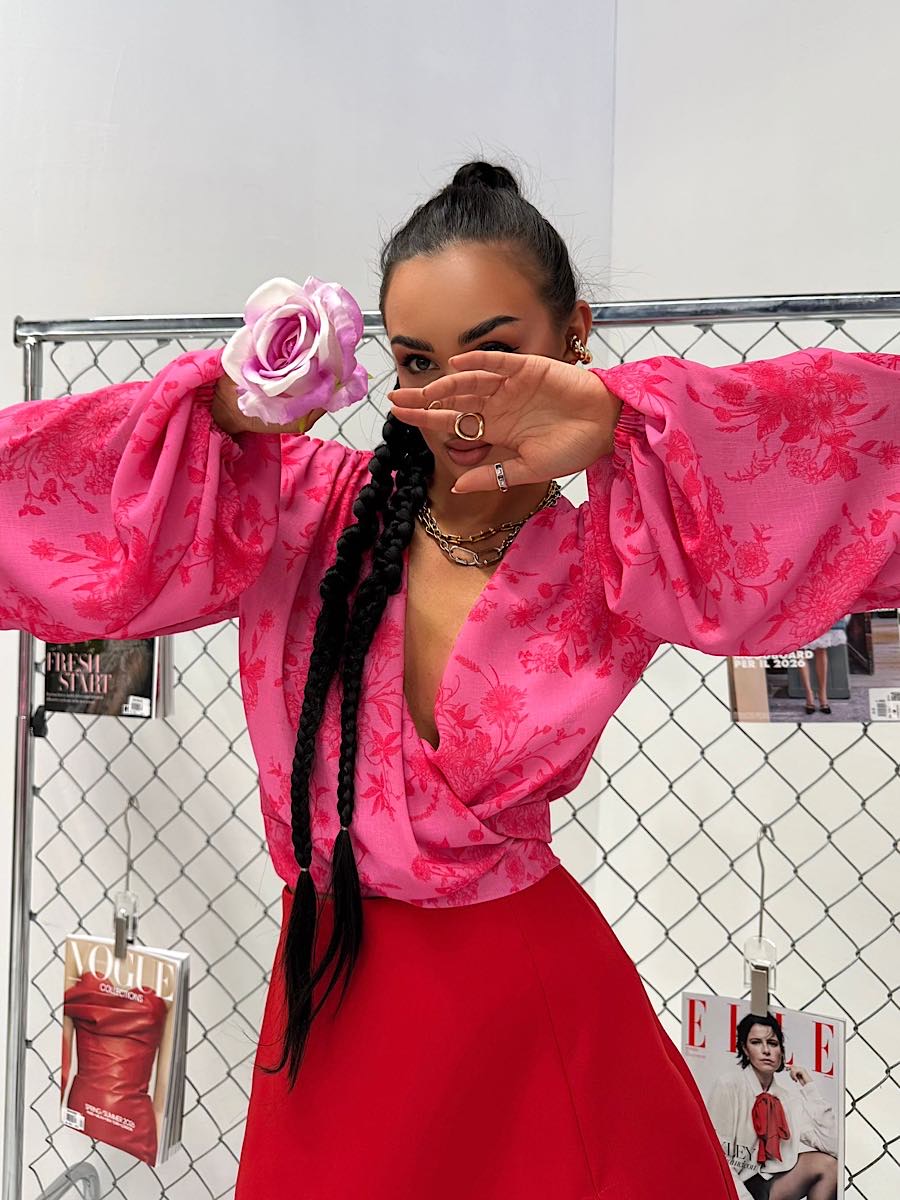Wiązana bluzka LaMilla w czerwone kwiaty na różowym tle.