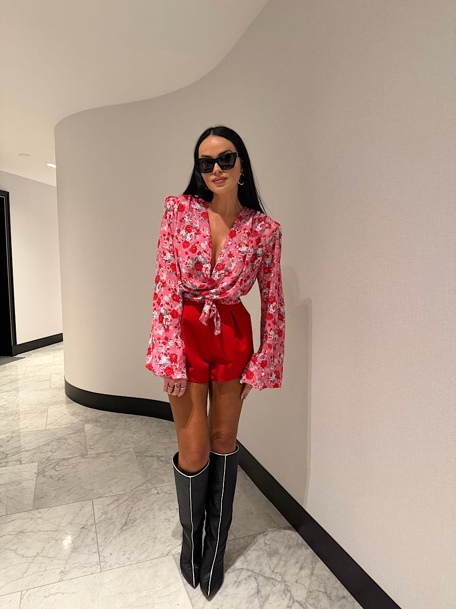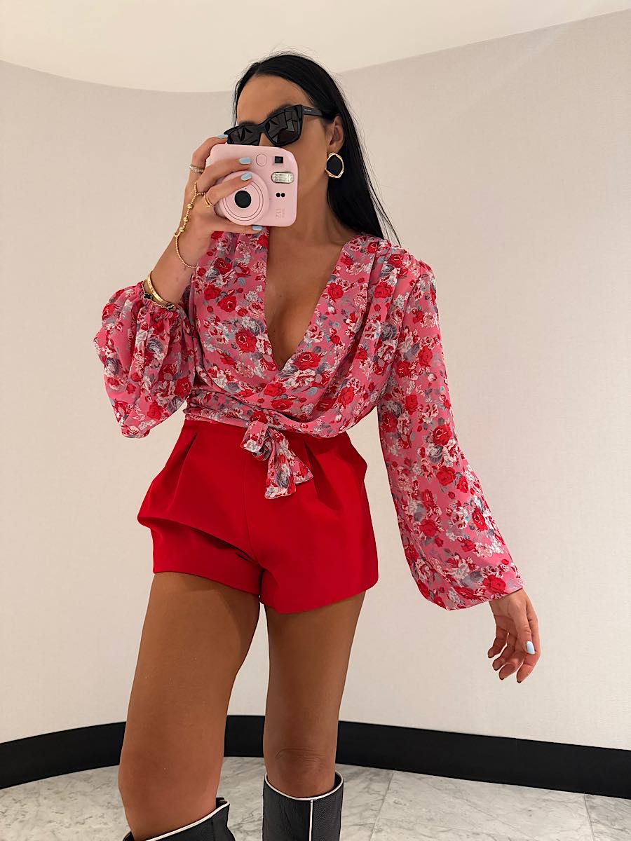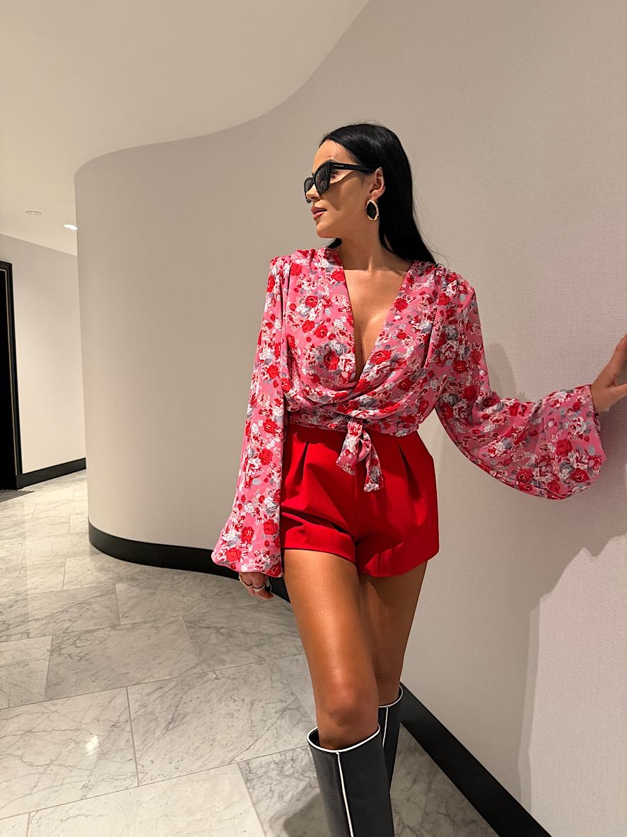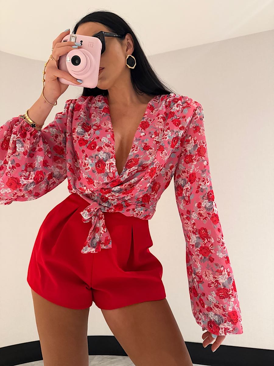 Wiązana bluzka LaMilla w czerwone kwiaty.