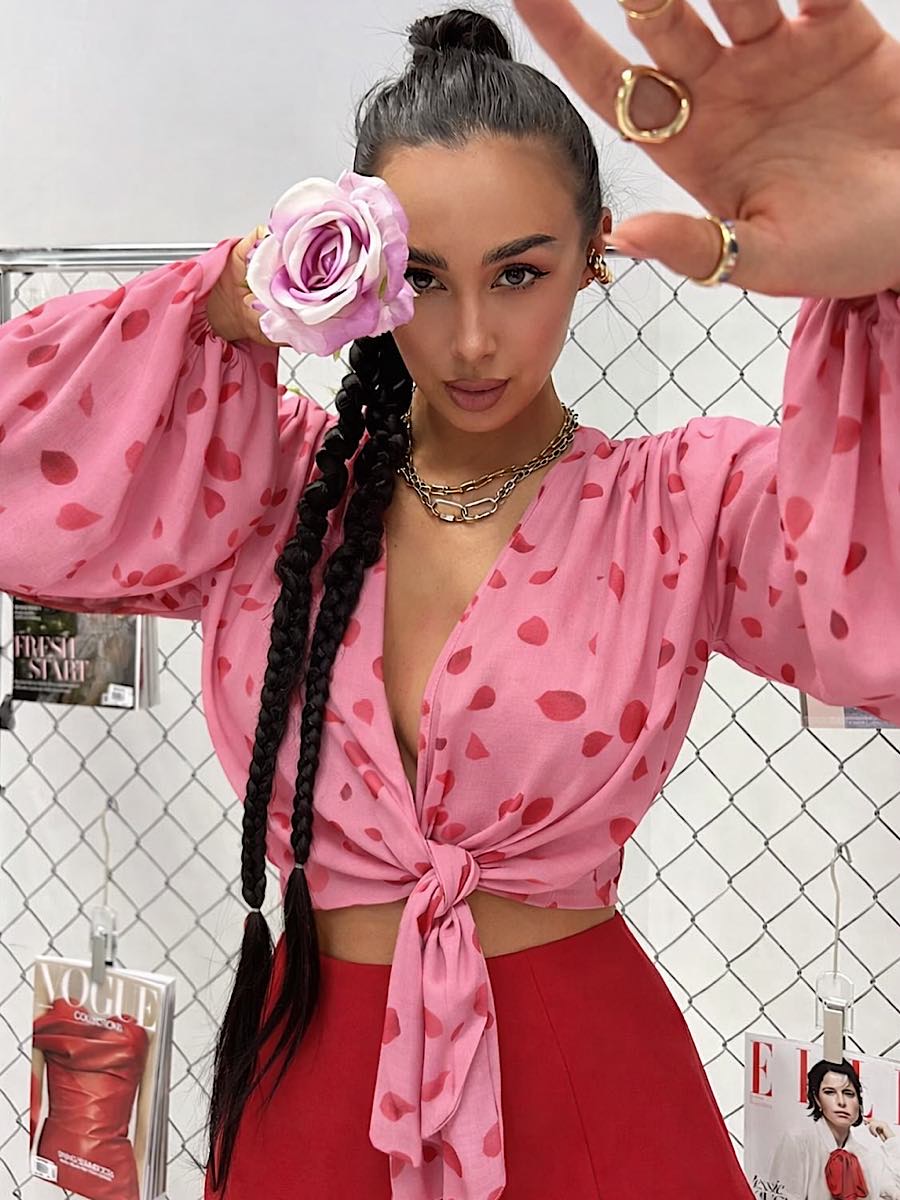 Wiązana bluzka LaMilla w różowym kolorze z płatkami róż.