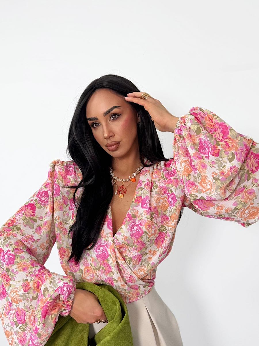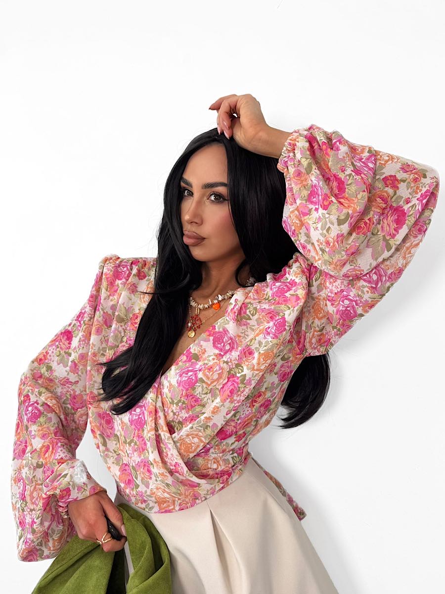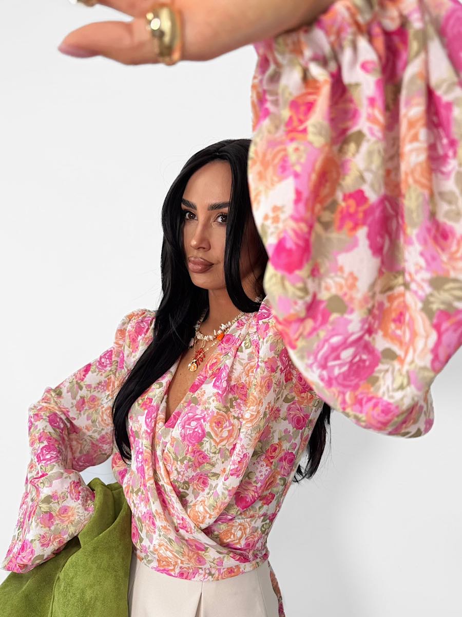 Wiązana bluzka LaMilla w różowo pomarańczowe kwiaty.