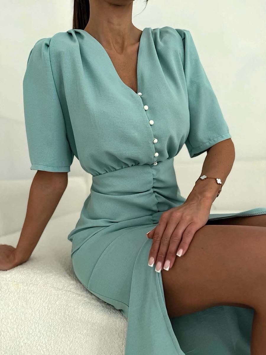 Krótki rękaw z delikatną poduszką na ramieniu. Na środku marszczenie zakończone rozcięciem. Z przodu posiada zapięcie na drobne guziczki. Zapinana z tyłu na kryty zamek. W pasie delikatne odcięcie z gumeczką. Fason dopasowany, mocno podkreślający kobiece kształty.